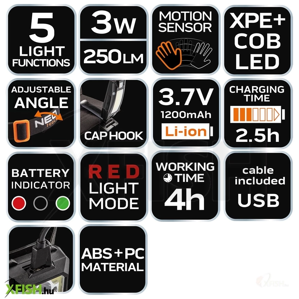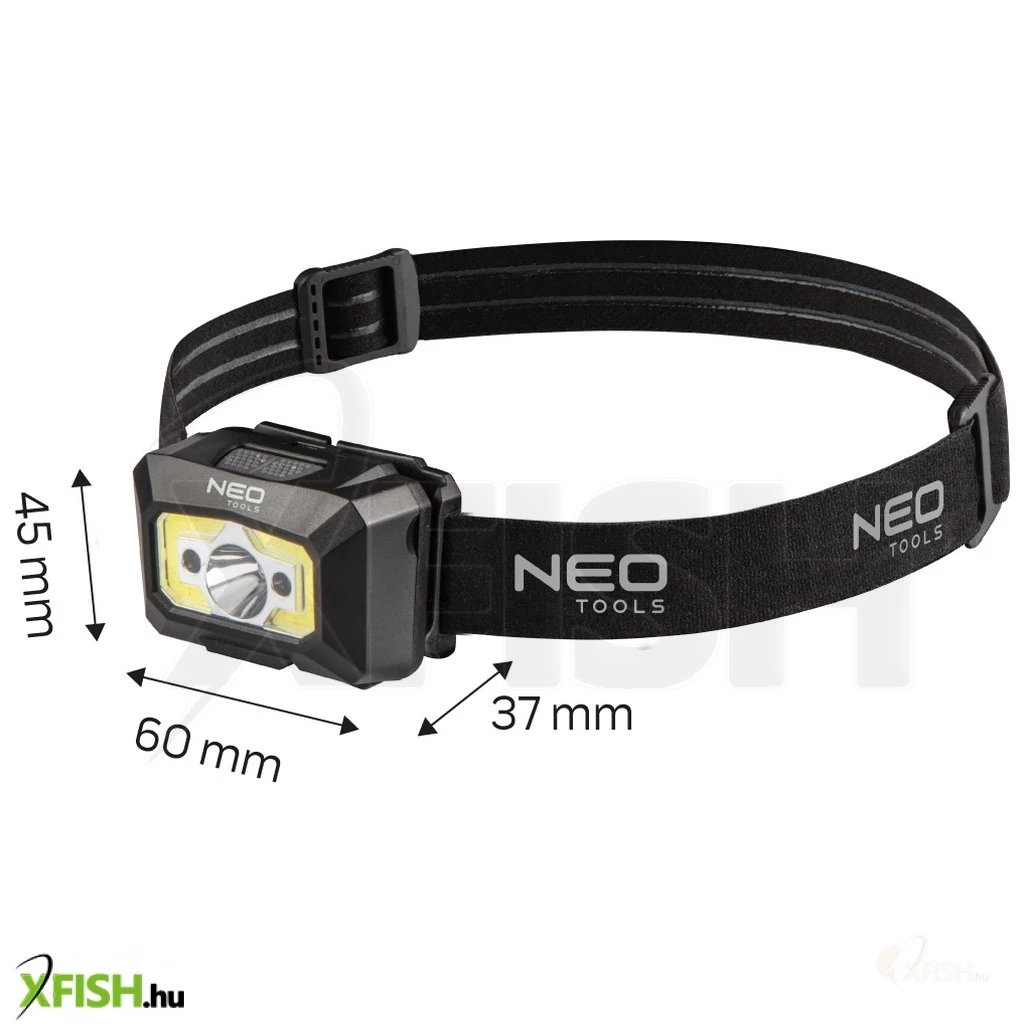 Neotools fejlámpa, tölthető, usb, 250 lum, cob LED + mozgásérzékelővel