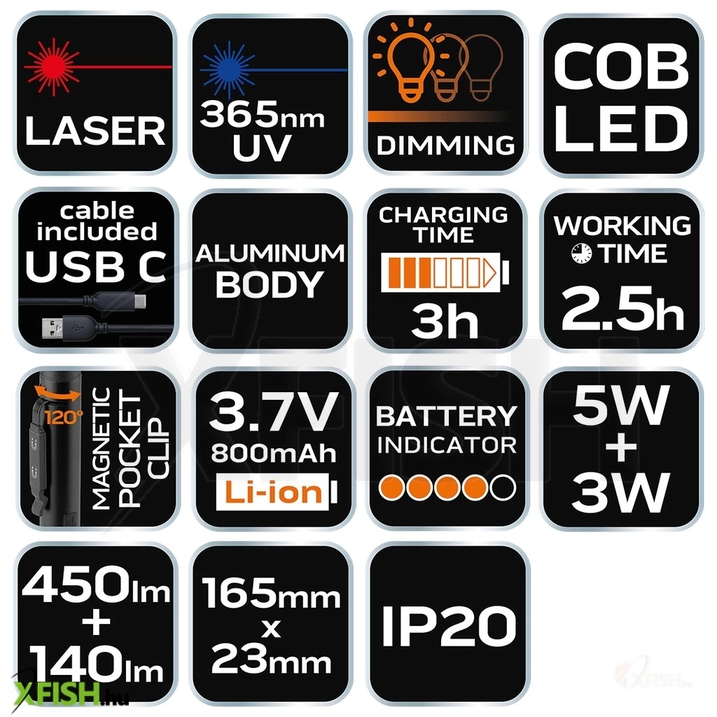 Az eszköz egyedülálló kialakításának köszönhetően rendelkezik UV és lézer funkciókkal is, amelyek ideálisak a szivárgás-leleplezéshez vagy a precíziós munkákhoz. Beépített 10 wattos teljesítményével képes hosszú időn keresztül egyenletes és megbízható fényt biztosítani, kiváló választás a sötét sarkok és nehezen megvilágítható területek esetében.