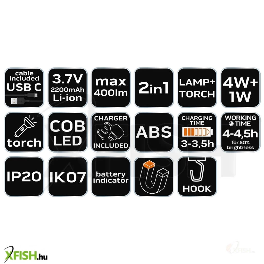 - Teljesítmény: 4 W COB LED + 1 W zseblámpa