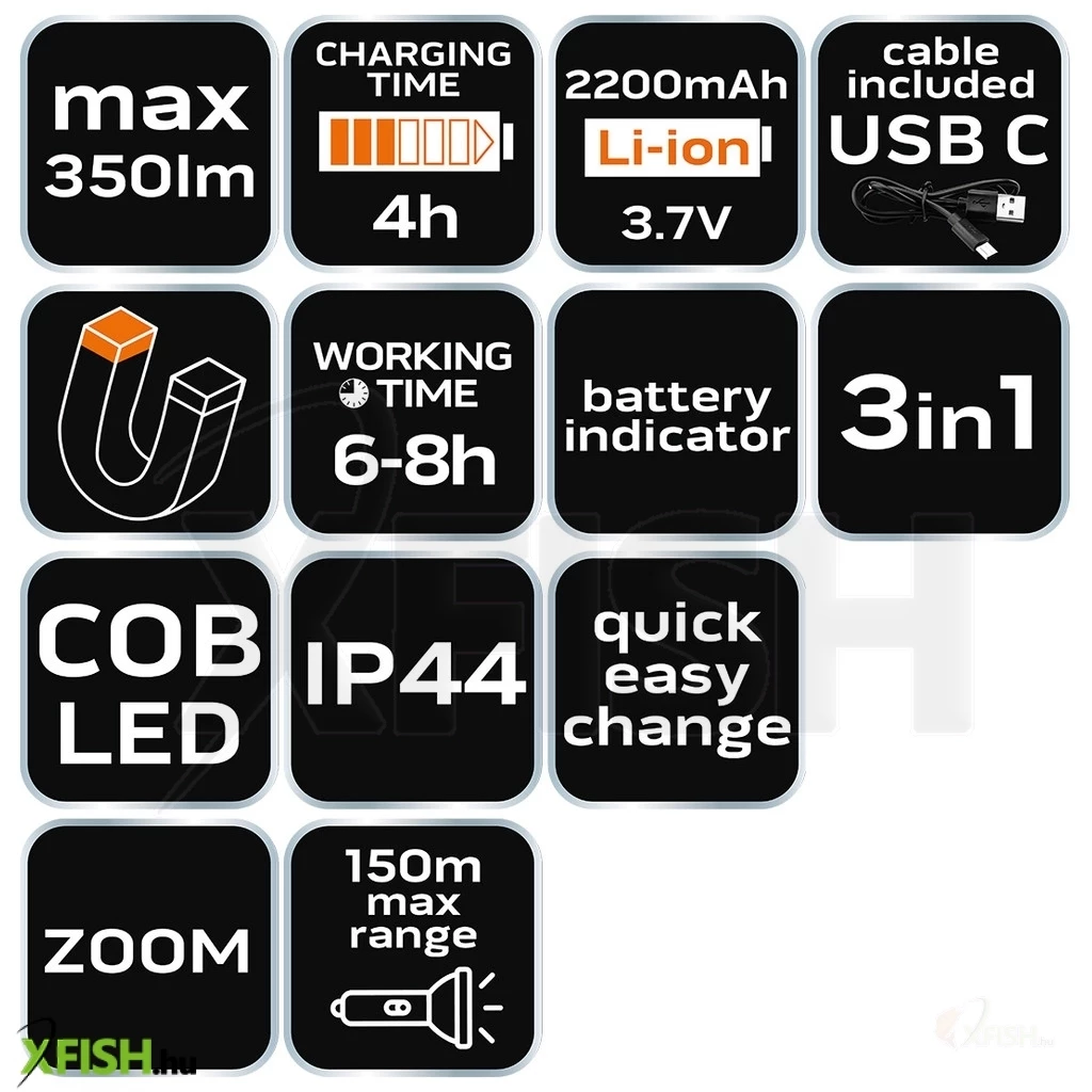 A lámpa maximális fényereje 350 lumen, a COB LED technológia pedig garantálja a kiváló fényminőséget. A világítóeszköz hatótávolsága eléri a 150 métert, így ideális társa lehet bármilyen szabadtéri tevékenység során. Praktikus mágneses talpának köszönhetően könnyedén rögzíthető fémfelületekre, míg az IP44-es vízállósági besorolása biztosítja a biztonságos használatot még zord időjárási körülmények között is.