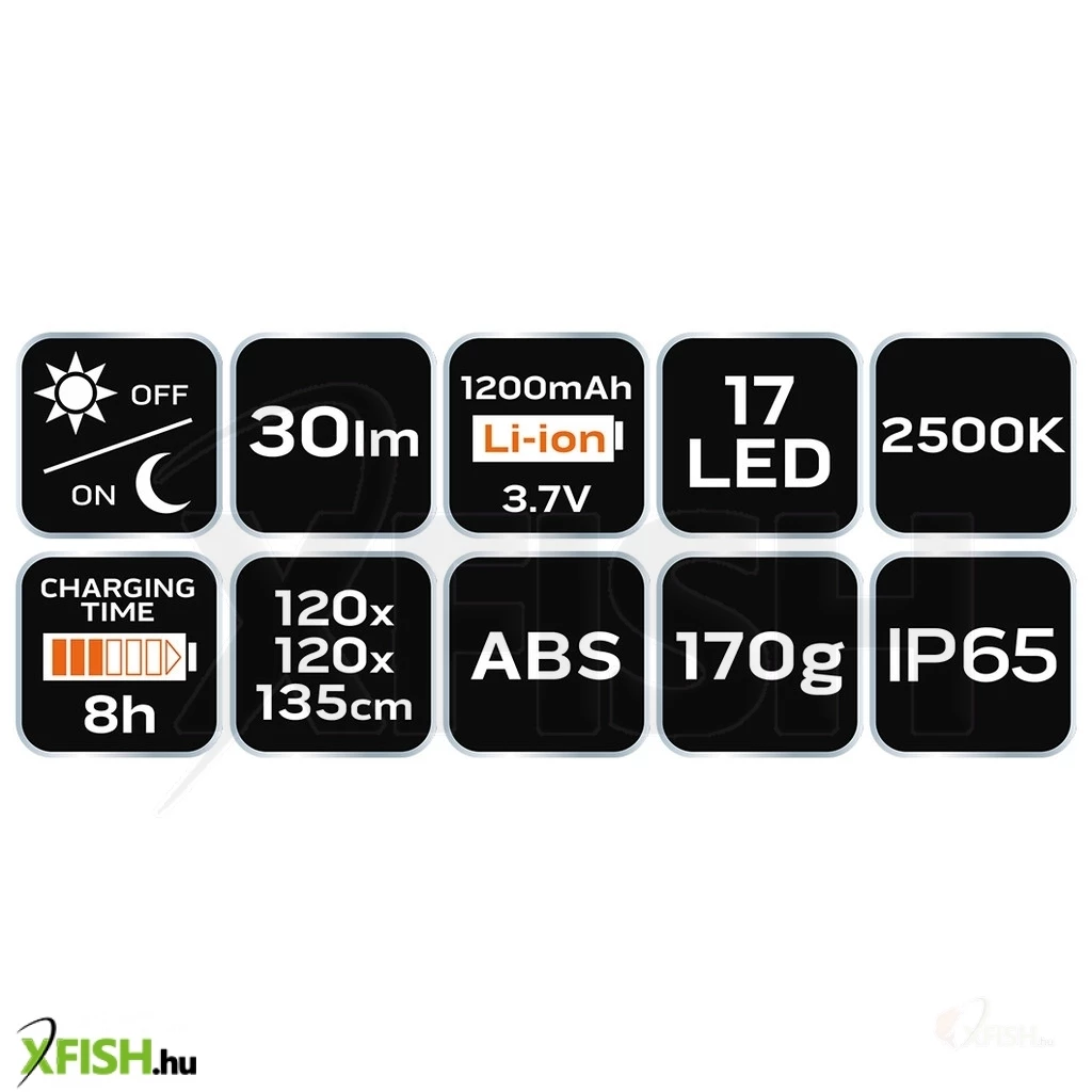 A Neotools napelemes kerti lámpa a tökéletes választás azok számára, akik hatékony és környezetbarát világítási megoldást keresnek kültéri alkalmazáshoz. Ez a 17 LED-es kerti lámpa lenyűgöző 30 lumenes fényerőt biztosít, mely elegendő ahhoz, hogy a kertet vagy bármely külső területet hatékonyan megvilágítsa az esti órákban. A lámpa egy 1200 mAh kapacitású, 3,7 V-os lítium-ion akkumulátorral működik, ami lehetővé teszi, hogy a készülék egy teljes napos töltés után akár fél napig is üzemeljen.