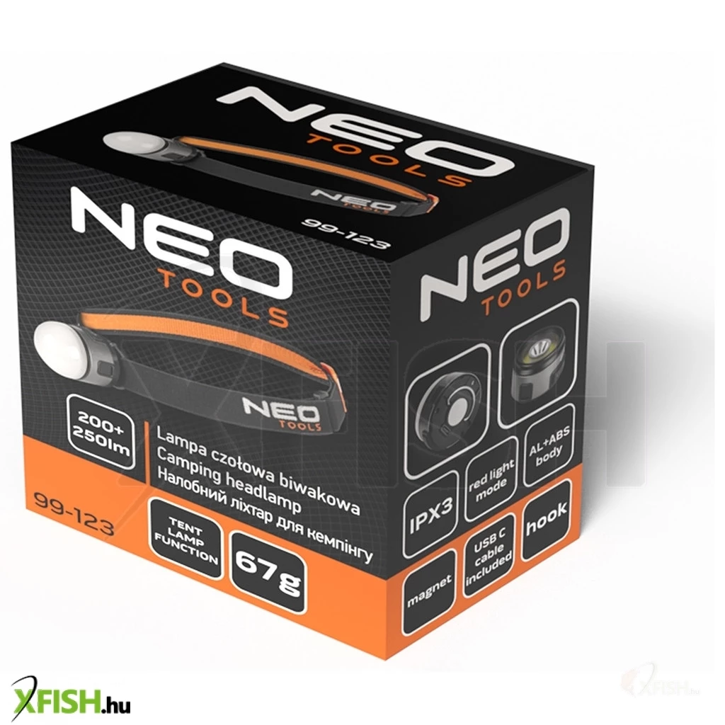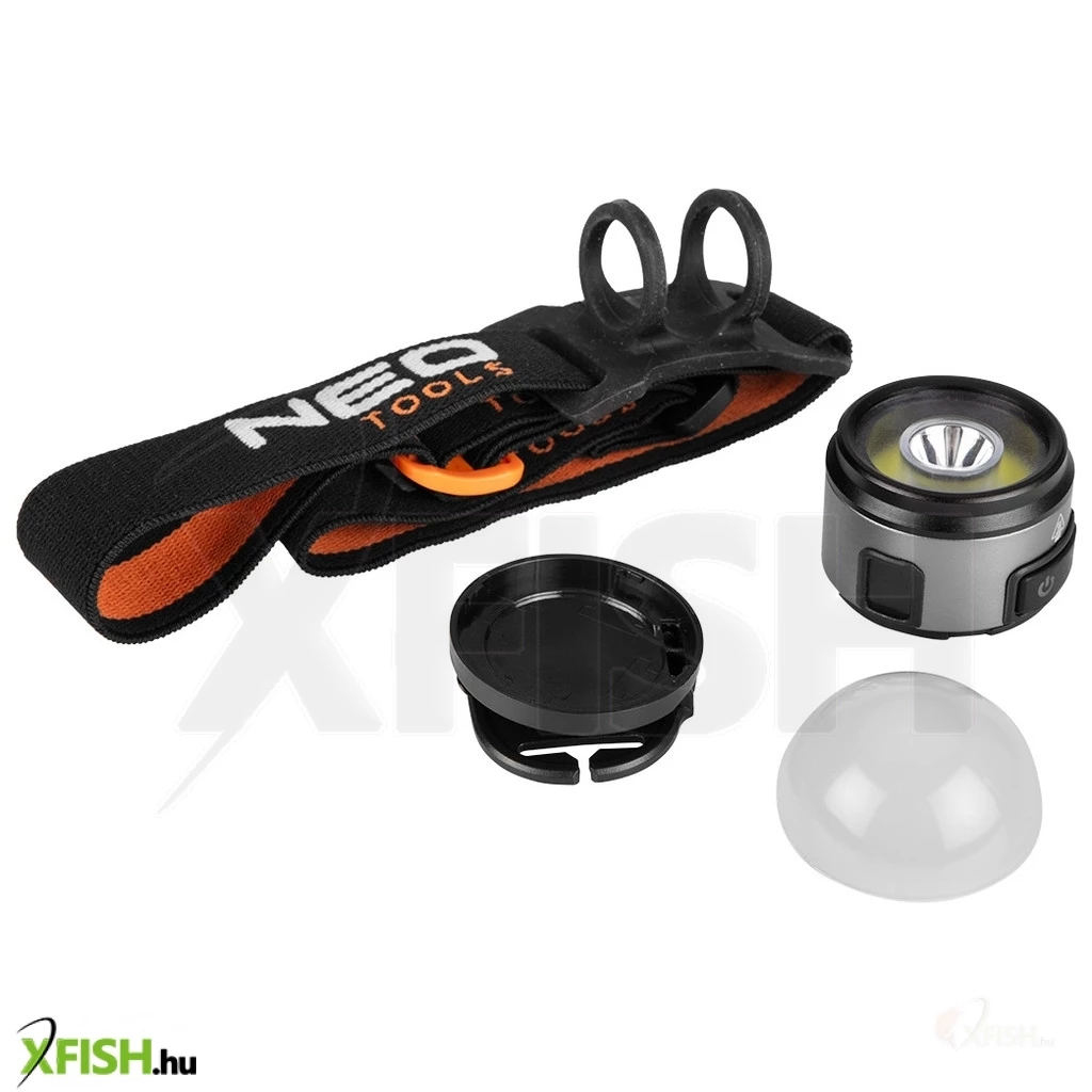 Neotools fejlámpa levehető pánttal, mágnes és sapkarögzítő lehetőség, fehér és vörös ledfény, USB töltőkábel, 250+200lm