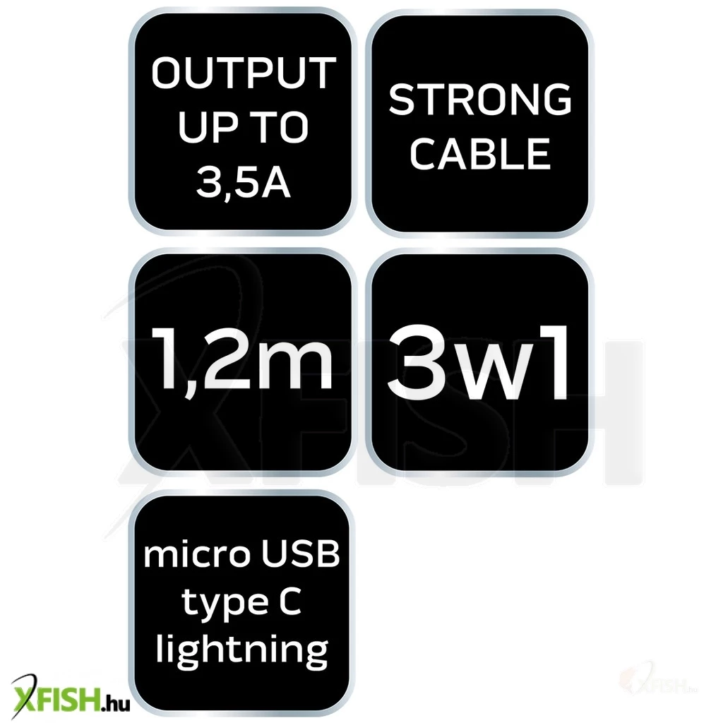 A 1.2 méteres kábel hosszúság ideális kényelmes használathoz, akár otthon, az irodában vagy útközben van szükség energia-utánpótlásra. Az univerzális csatlakozási lehetőségek – USB-A bemenet és három különböző kimenet: USB-C, Lightning és Micro USB – lehetővé teszik, hogy egyetlen kábel segítségével töltsön fel szinte bármilyen eszközt, a legújabb okostelefonoktól az idősebb készülékekig.