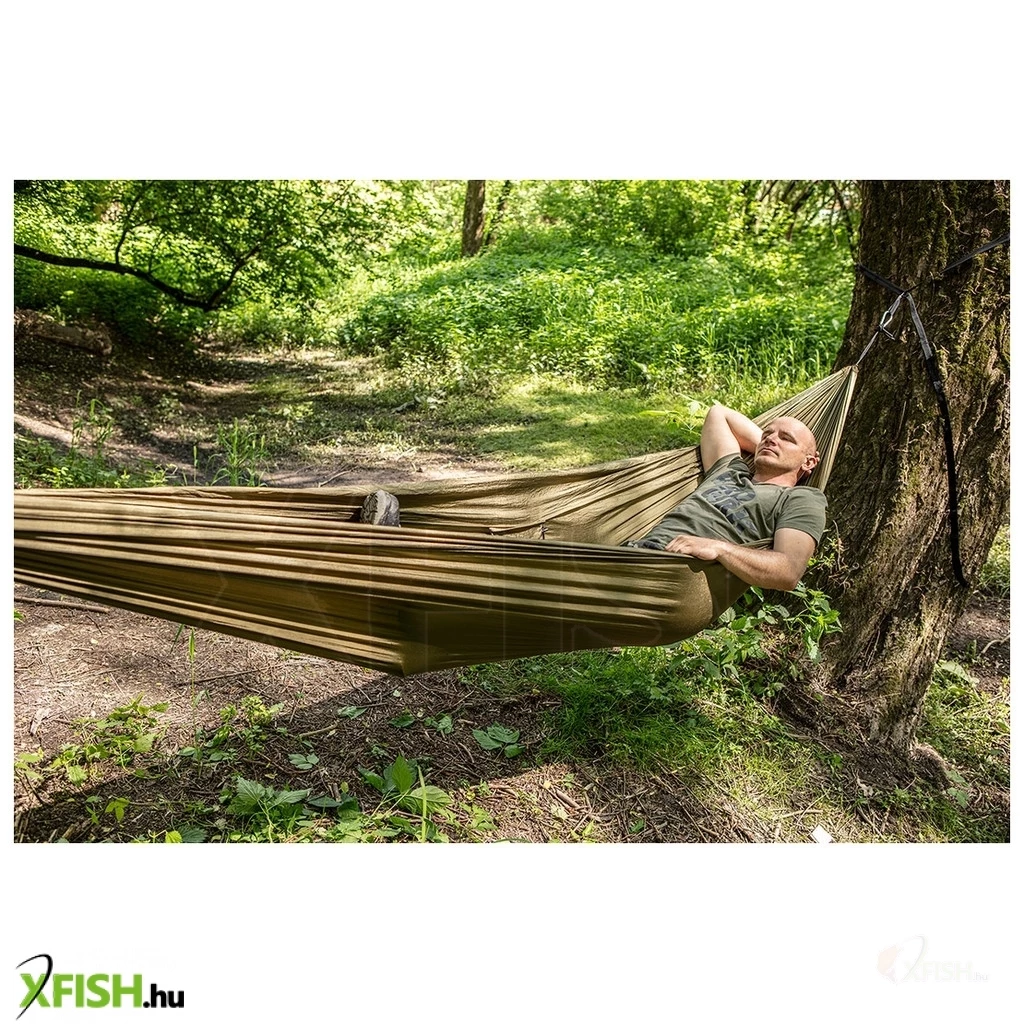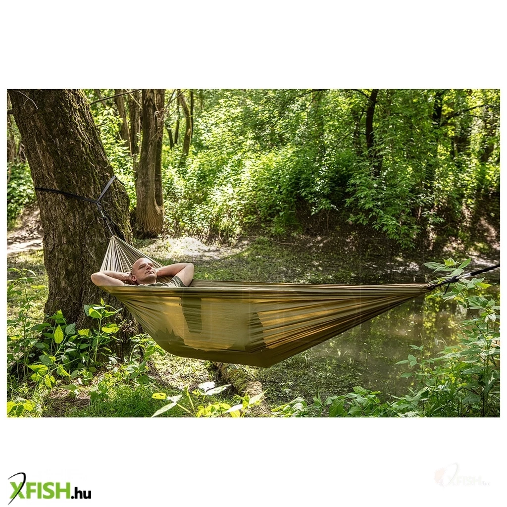 A függőágy készlet mindent tartalmaz, amire szüksége lehet a felállításhoz, például hevedereket és zsinórokat, valamint két karabinert. A terméket könnyedén szállíthatja a bevarrt hordtáskának köszönhetően, amelyben a függőágy összecsomagolva kis helyen is elfér. A sötétzöld szín diszkrét álcázást biztosít az erdőben, így az álombéli természetközeli élmény garantált.