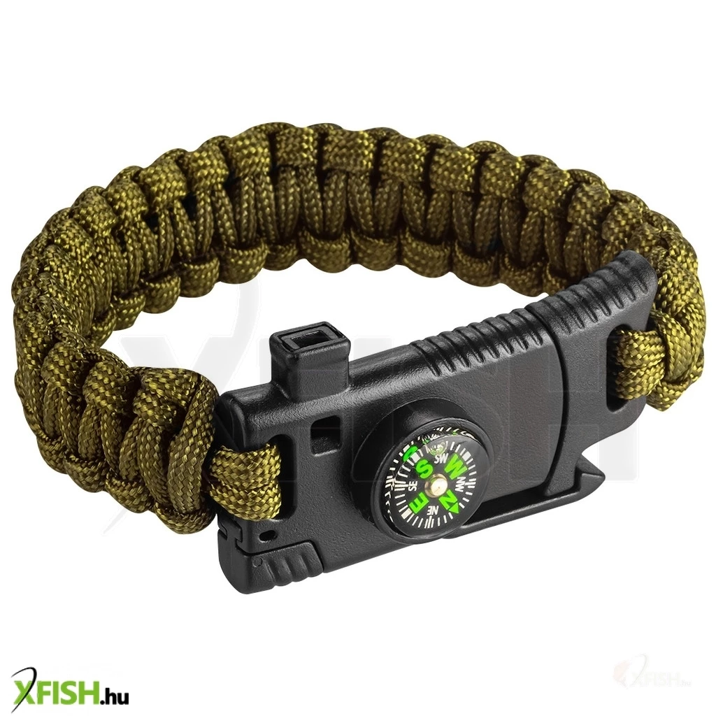 A karkötő még egy éles kést is rejt, amely hasznos minden olyan helyzetben, ahol gyors javításokra vagy vágásokra van szükség. A síp pedig a vészjel adására szolgál, így segít elérni másokat baj esetén. A 26 mm széles karkötő sötétzöld színe miatt diszkrét megjelenésű, mégis elegáns kiegészítője lehet bármilyen túrafelszerelésnek.