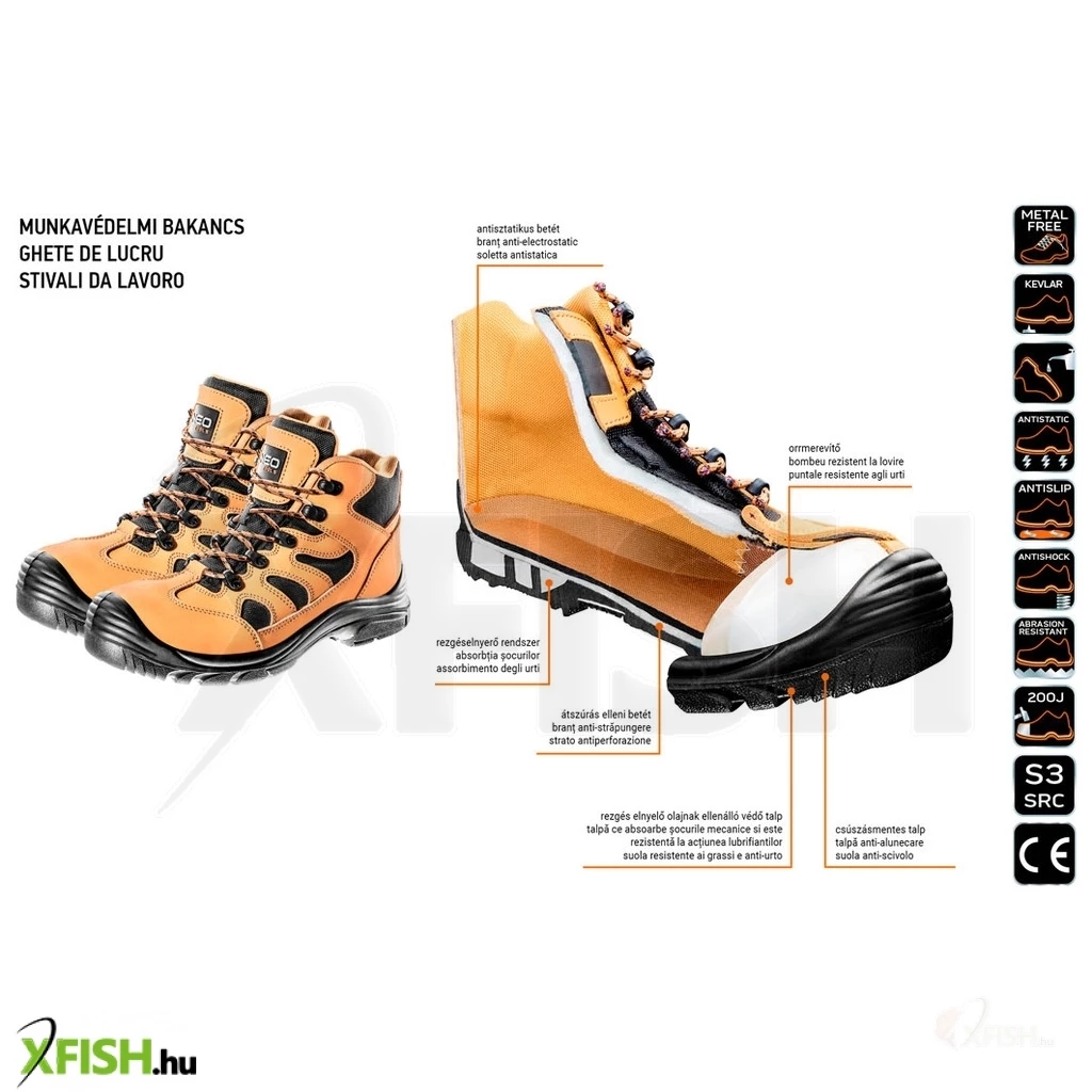 A Neotools munkavédelmi bakancs egy kiváló választás azok számára, akik nemcsak a kényelmet és a strapabírást, hanem a maximális biztonságot is keresik a horgászat során. Ez a bakancs a legújabb technológiáknak köszönhetően S3 SRC munkavédelmi besorolással rendelkezik, ami biztosítja, hogy minden szükséges területen megállja a helyét.