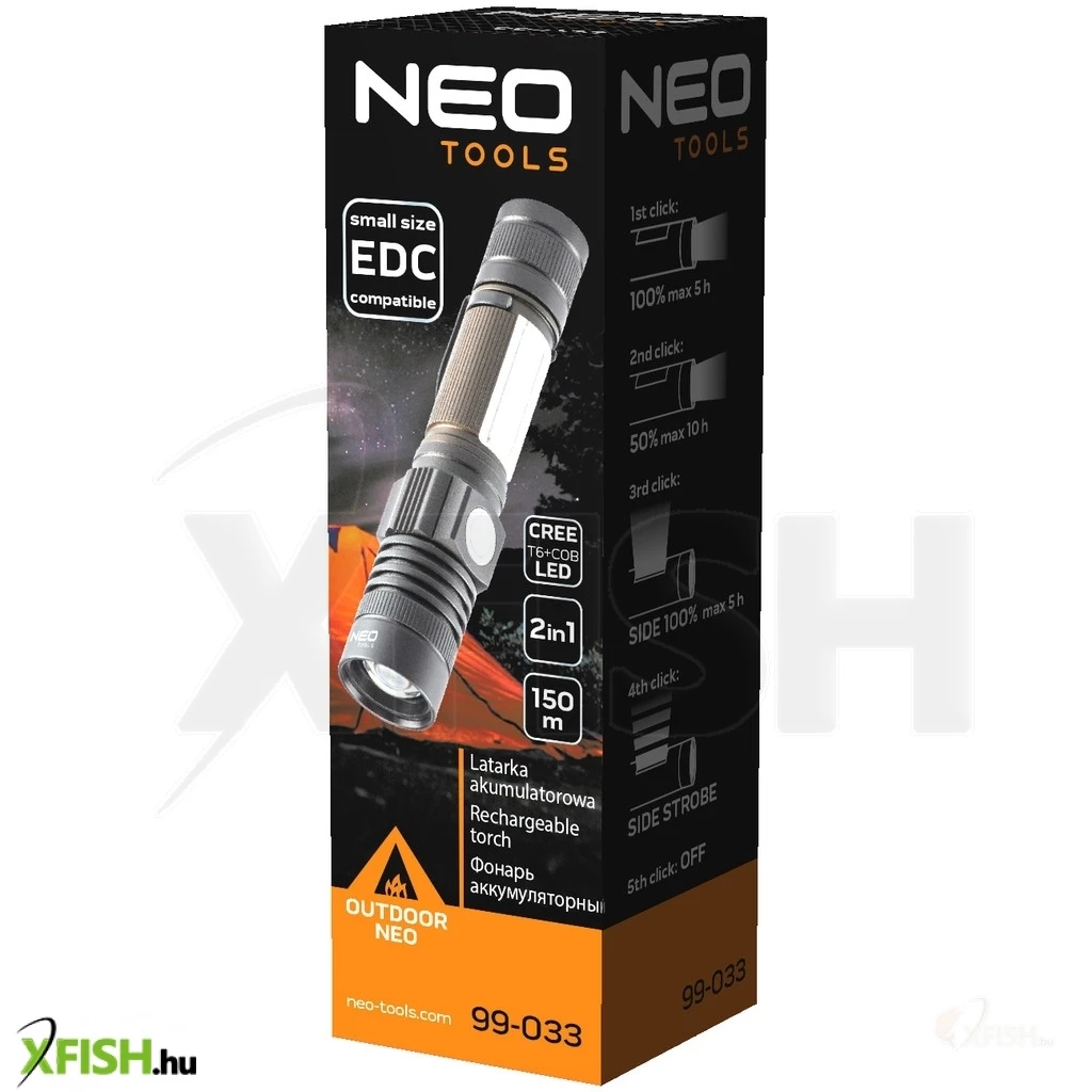 A Neotools zseblámpa robusztus felépítése biztosítja a tartósságot, a CE tanúsítvány pedig igazolja, hogy megfelel az európai biztonsági előírásoknak. A zseblámpa hatótávolsága 150 méter, így nagy területek megvilágítására is képes. A termékhez tartozó 2000 mAh kapacitású 3.7V-os Li-ion akkumulátor egyszerűen tölthető az USB csatlakozón keresztül, a szükséges kábelt pedig az alapcsomag tartalmazza. A zseblámpa maximális üzemideje elérheti a 10 órát, ami hosszabb horgász kirándulások során is elegendő. Az IP20 védettséggel a zseblámpa ellenáll a kisebb mechanikai hatásoknak és szilárd bemeneti anyagoknak.