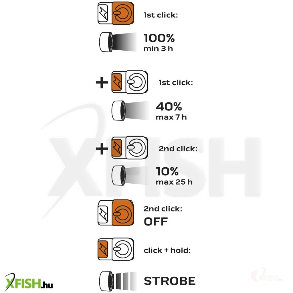 - Világítási funkciók: 100%, 40%, 10%, stroboszkóp