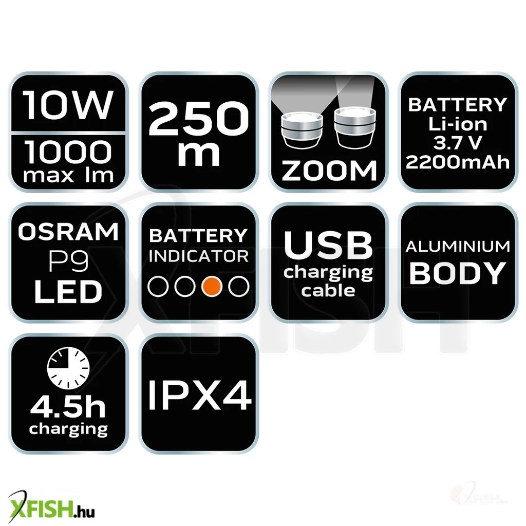 A zseblámpa szíve az 1000 lumenes, 10 wattos teljesítményű OSRAM P9 LED, amely rendkívüli fényerőt kölcsönöz neki, akár 250 méteres hatótávolsággal. Ez a lenyűgöző világítási teljesítmény lehetővé teszi, hogy bármilyen sötét helyzetet könnyedén megvilágítson, függetlenül attól, milyen távolságra van. Négy világítási funkcióval rendelkezik, amelyek közül választhat az aktuális igényei alapján: teljes 100%-os fényerő, energiatakarékos 40% és 10%-os üzemmód, valamint egy stroboszkóp funkció is, ha extra figyelemfelkeltésre van szükség.