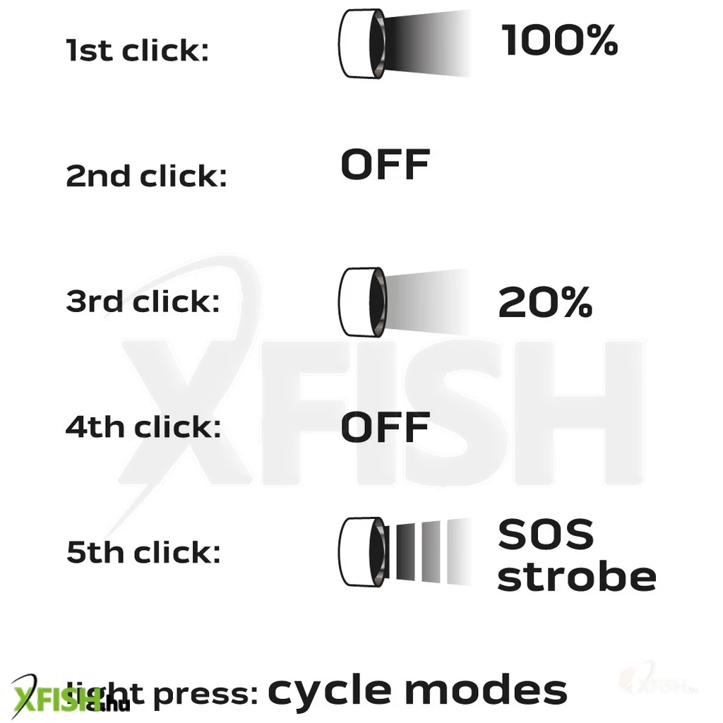 - Világítási funkciók: 100%, 20%, stroboszkóp