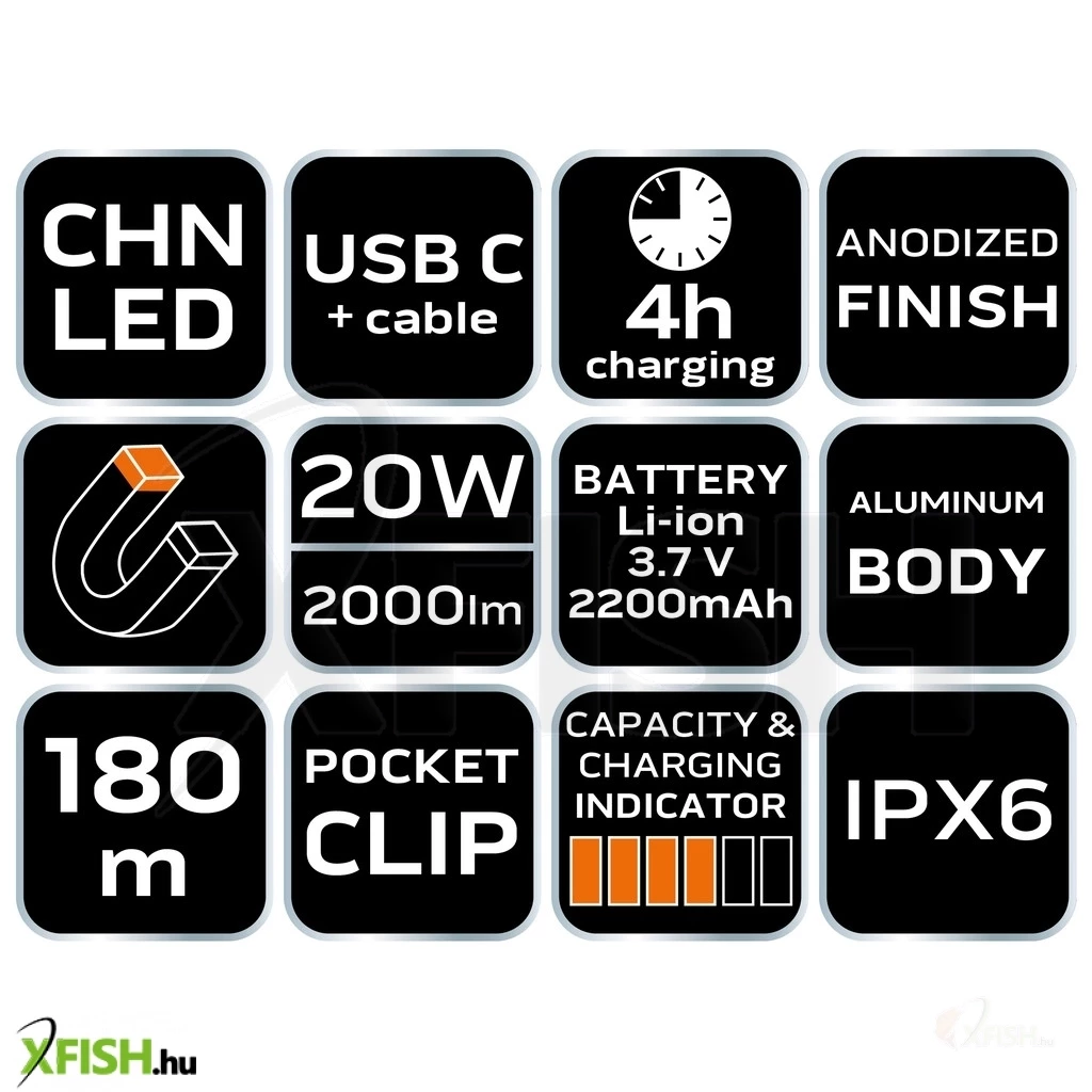- Műszaki paraméterek: USB C, 2000 lm, 20 W, CHN LED, IPX6