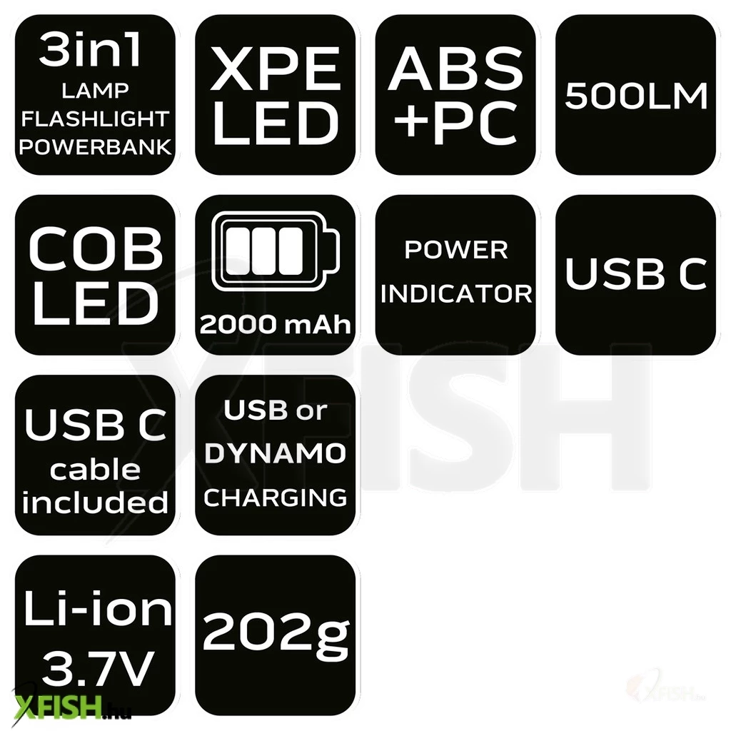 - Sokoldalú 3 az 1-ben funkció: kempinglámpa, zseblámpa és powerbank