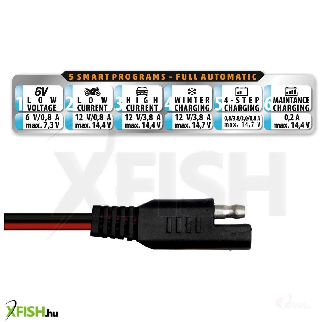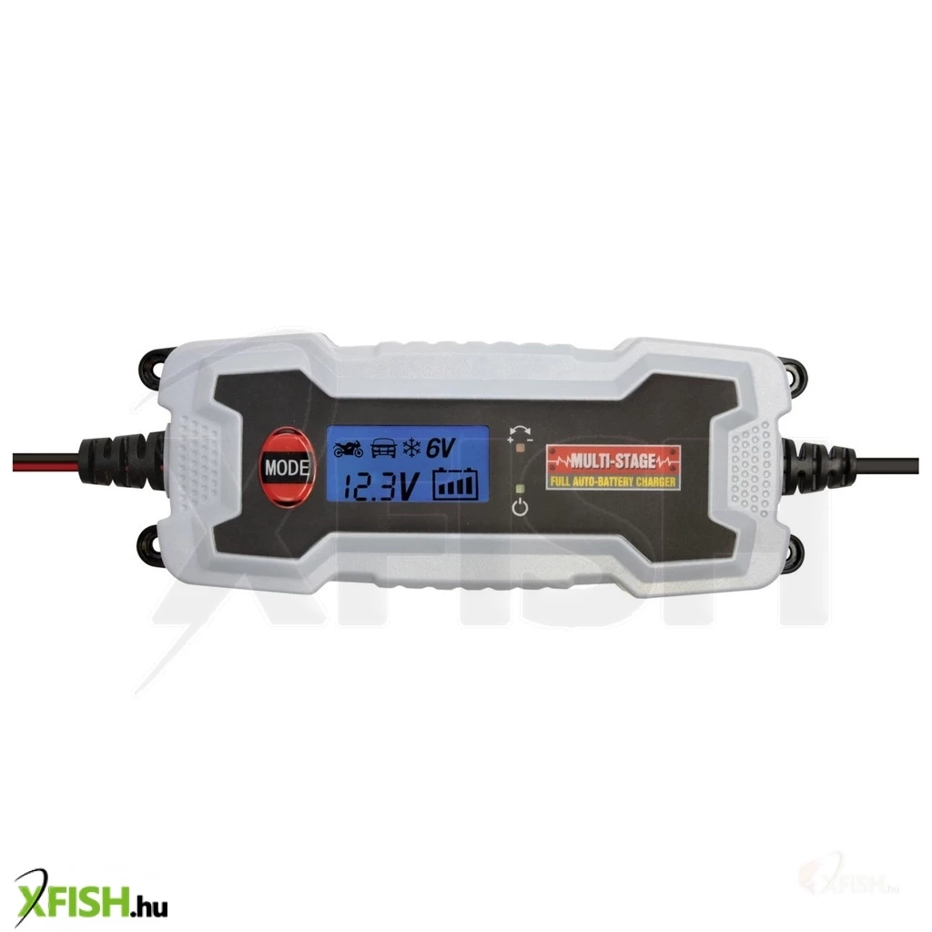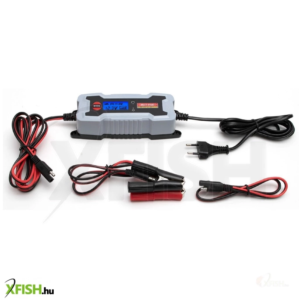 A készülék 5 lépcsős automata smart töltőprogrammal ellátott, így több szintű, állandó áramú vagy kímélő töltést végezhet. A töltő- csatlakozó cserélhető csipeszre vagy gyűrűs sarura. A kék háttérvilágítással ellátott LCD kijelzőn jól láthatóak az adatok.