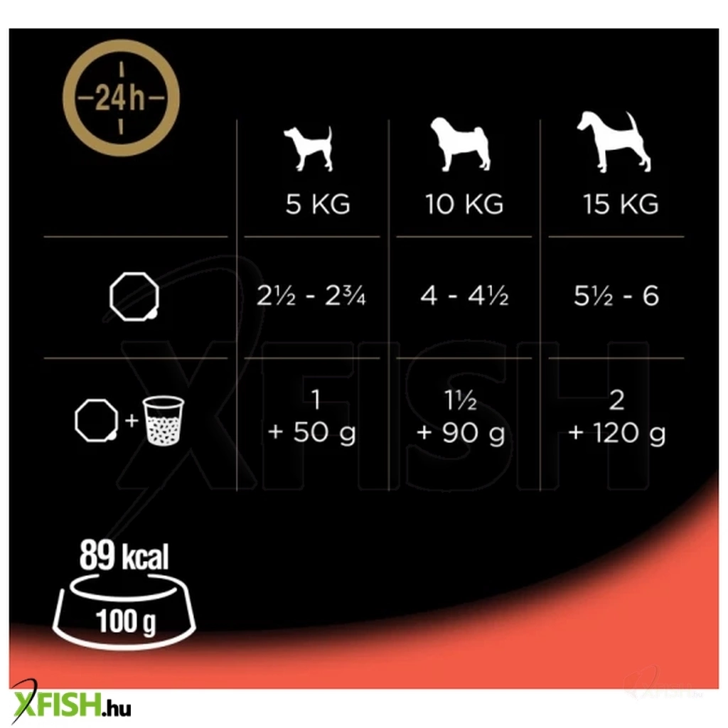 Etetési útmutató: Napi 2 és 1/2 alutálcás eledel 5 kg-os kutyáknak, 3 és 1/2 alutálcás eledel 7 kg-os kutytáknak, és 4 és 1/2 alutálcás eledel 10 kg-os kutyáknak.