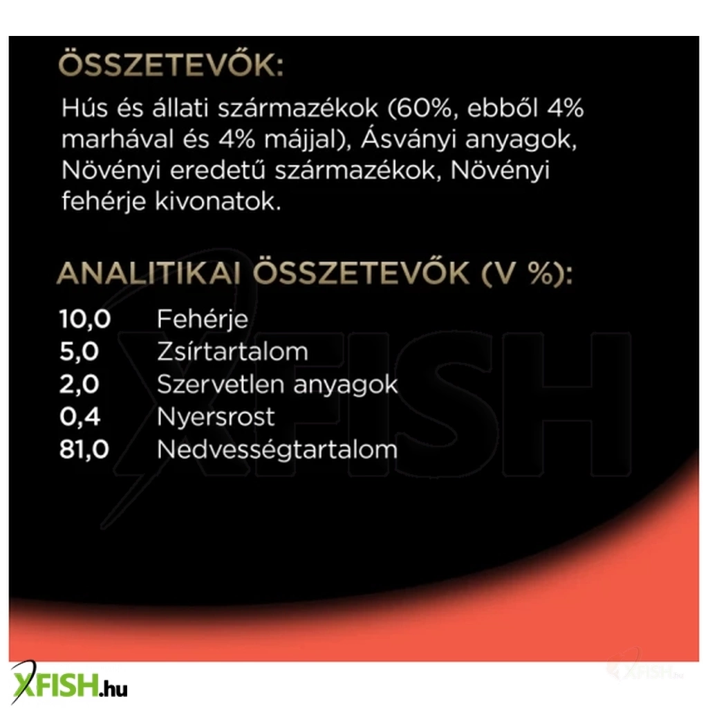 Összetevők: Hús és állati származékok (60%, ebből 4% marhahús), Ásványi anyagok, Növényi eredetű származékok