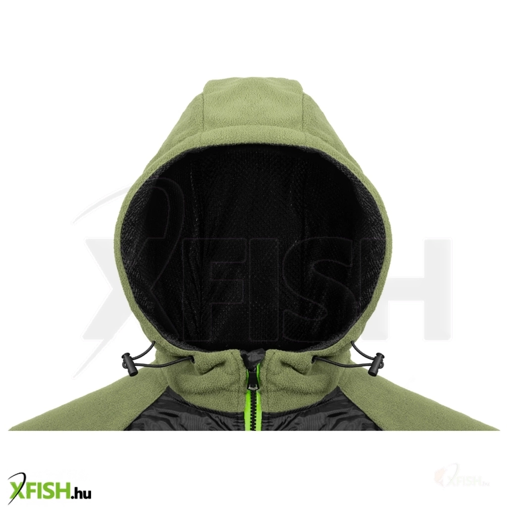 A kabát középső része könnyű, steppelt betétből készült, amely hatékonyan véd a széltől és a hidegtől, míg az ujjak, az oldalsó részek és a kapucni puha fleece anyagból készültek. Ez kellemes tapintást, jó hőérzetet és maximális mozgásszabadságot biztosít még párás, hűvös napokon is. Az állítható kapucni belül légáteresztő hálóval bélelt, ami tovább növeli a kényelmet aktív mozgás közben, és jobb szellőzést biztosít.