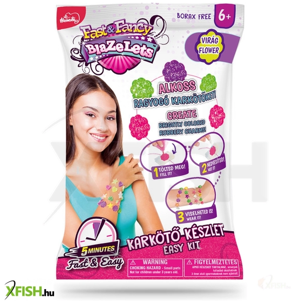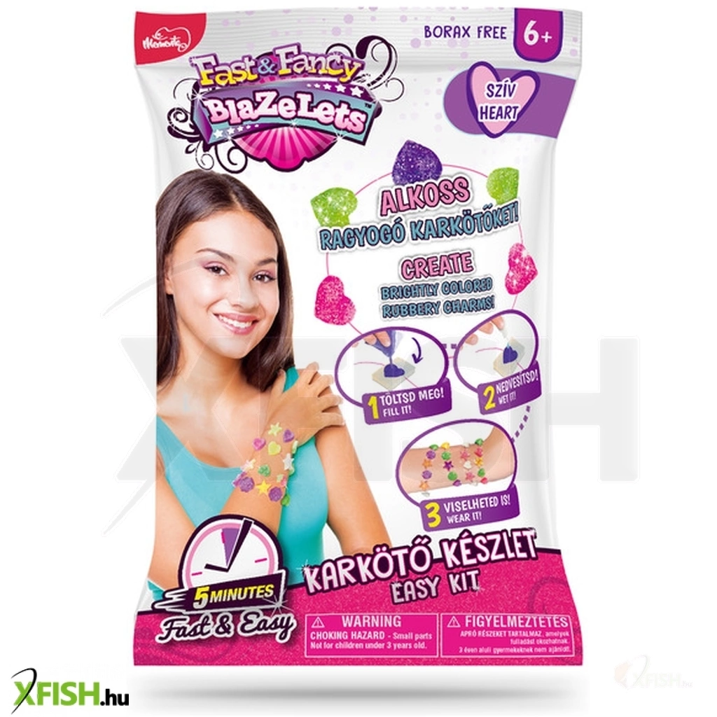 A Fast& Fancy kreatív szettjeivel varázslatos színekben pompázó karkötőket készíthetsz! Különböző színekben és formákban alkothatod meg a legdivatosabb, rugalmas ékszereidet! Minden szett tartalmazza a színes porokat, amikből a formázóba adagolva, víz segítségével tudod a karkötőket elkészíteni. Fast&Fancy karkötőkészítő 1 db-os készletével medálos karkötőt készíthetsz, szív, virág vagy csillag tematikával. A szett tartalma: 1 db forma 1 db vízadagló 1 db varázspor 1 db műanyag zsinór A szett tartalma 1 db rugalmas karkötő elkészítéséhez elegendő.