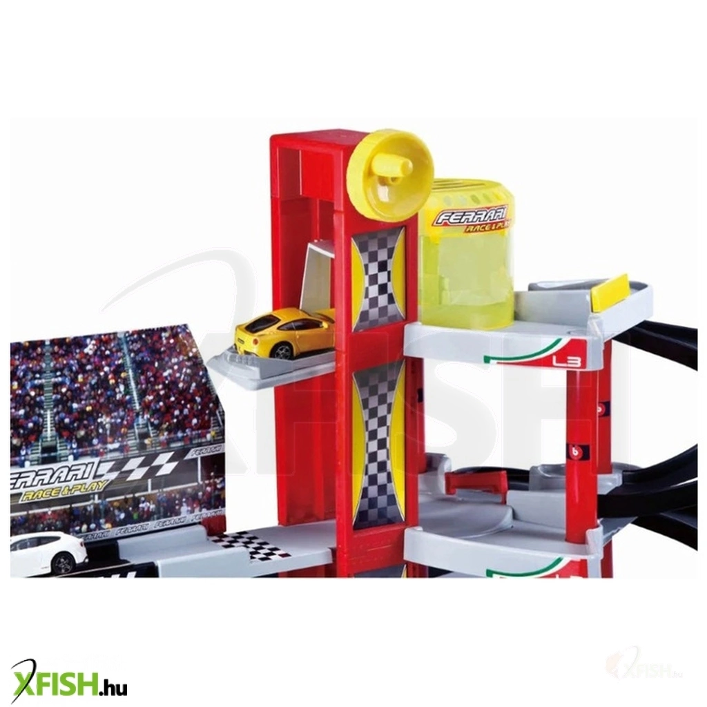 Parkold le a Ferrari autókat a garázsban, és versenyezz velük a pályán! Az 1:43 méretarányú Bburago Ferrari Racing parkolóház egy felvonóval, és spirálos lehajtóval készült garázs, ahova a Bburago Ferrari autókat tudod letenni. A parkolóház 2 emeleten tudja fogadni az autókat, a garázs egy felüljáróval is fel van szerelve. Tekerd fel a liftet, hogy a felső szintet is elérjék a járgányok. A Bburago Ferrari Racing parkolóház együtt használható bármelyik, 1:43 méretaránnyal készült Bburago Ferrari kisautóval, a készlet egy autót is tartalmaz. Összerakott méretek: 99 x 58 x 48 cm.