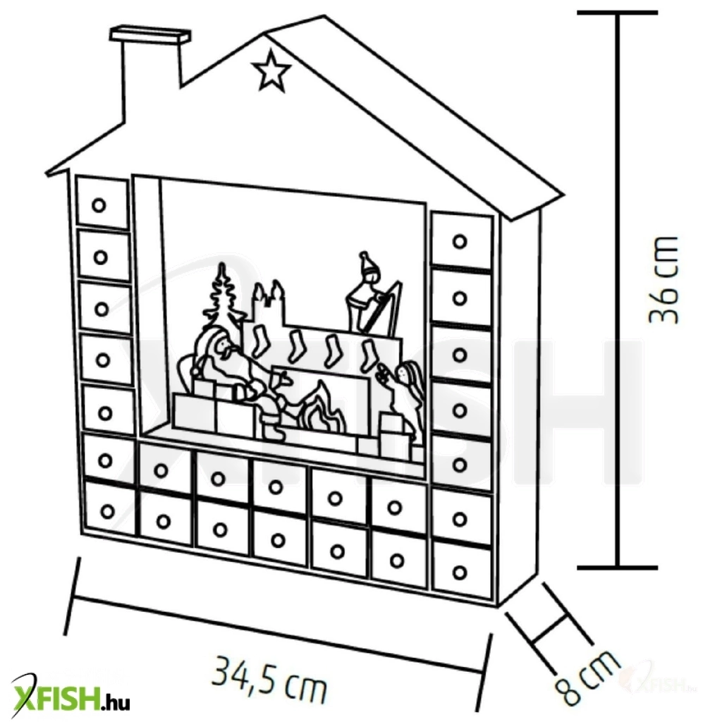 A 34,5 × 8 × 36 cm-es méret ideális a polcra, komódra vagy asztalra helyezve, anélkül hogy sok helyet foglalna. A LED világítás 2 db AA elemmel működik (az elemek nem tartozékok), így a naptár bárhol könnyen elhelyezhető – nincs szükség konnektorra vagy kábelekre. Az elemes tápellátásnak köszönhetően biztonságos és mobilis használatot biztosít, különösen kisgyermekes otthonokban.