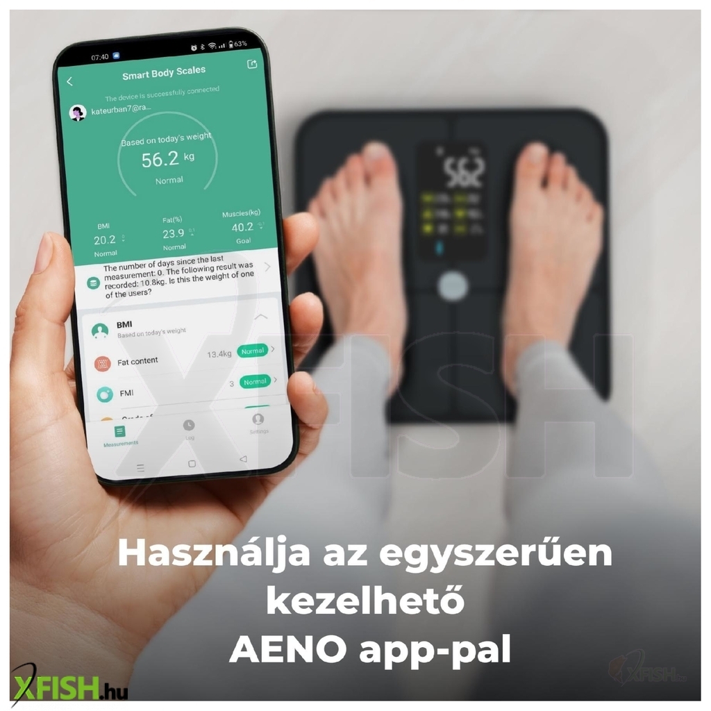 Az Aeno smart alkalmazás Bluetooth 5.0 szabványon keresztül csatlakozik a mérleghez, és egyértelműen jeleníti meg az adatokat. A rendszer 16 testösszetétel-értéket számít ki (pl. testzsír, izom és csonttömeg, víztartalom, protein arány, zsigeri zsírindex, bmr, metabolikus kor).