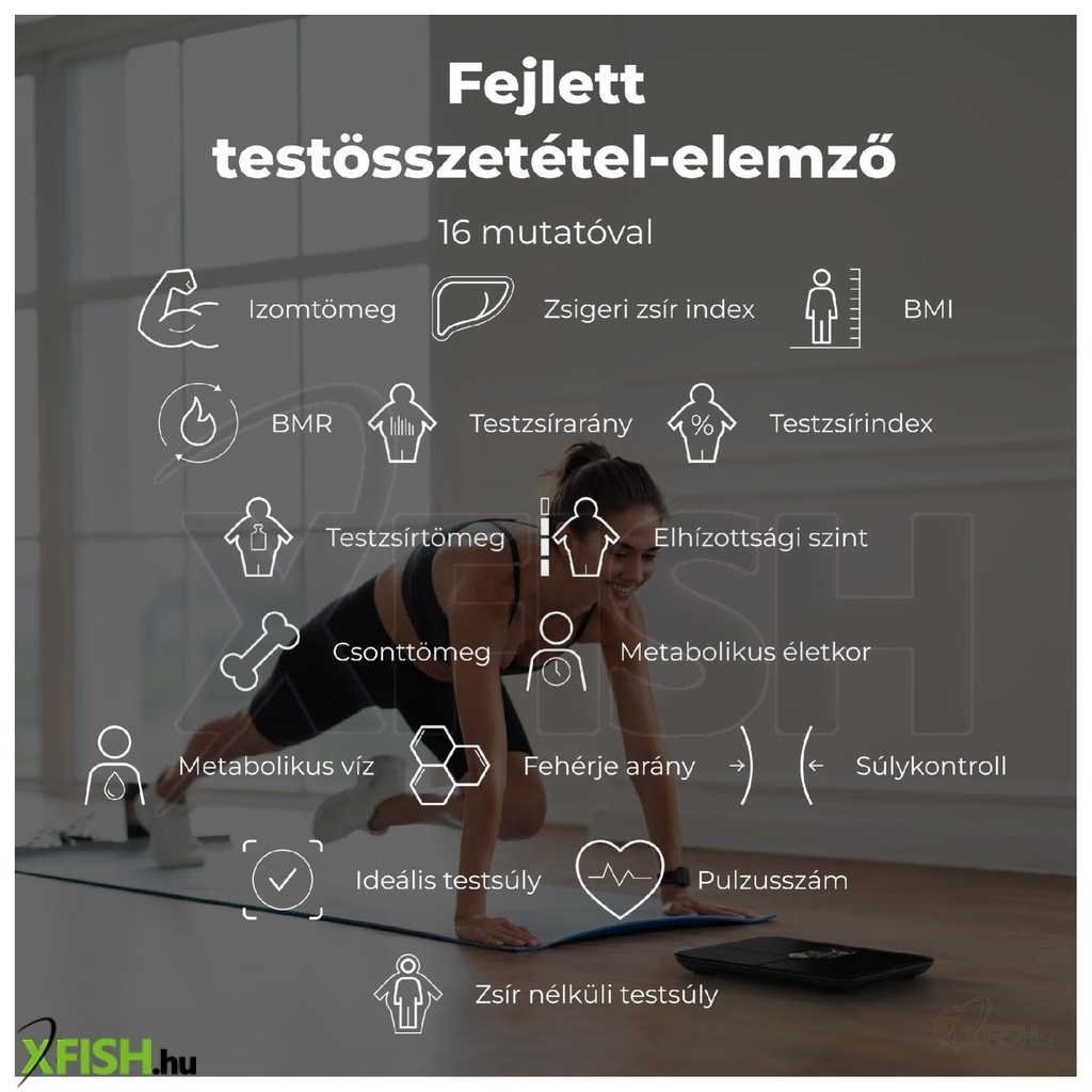 - 16 testösszetétel-érték kiszámítása, köztük bmr, zsigeri zsír, csont- és izomtömeg
