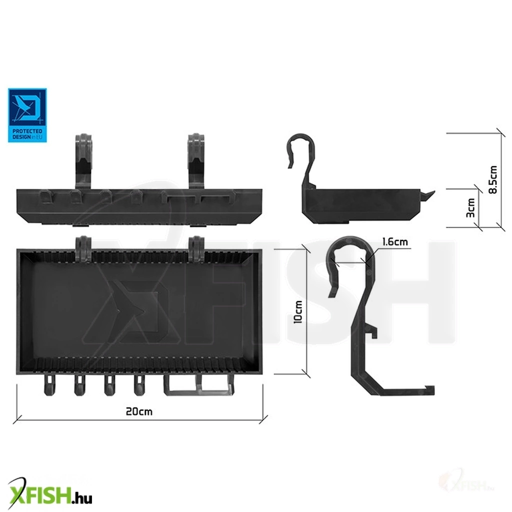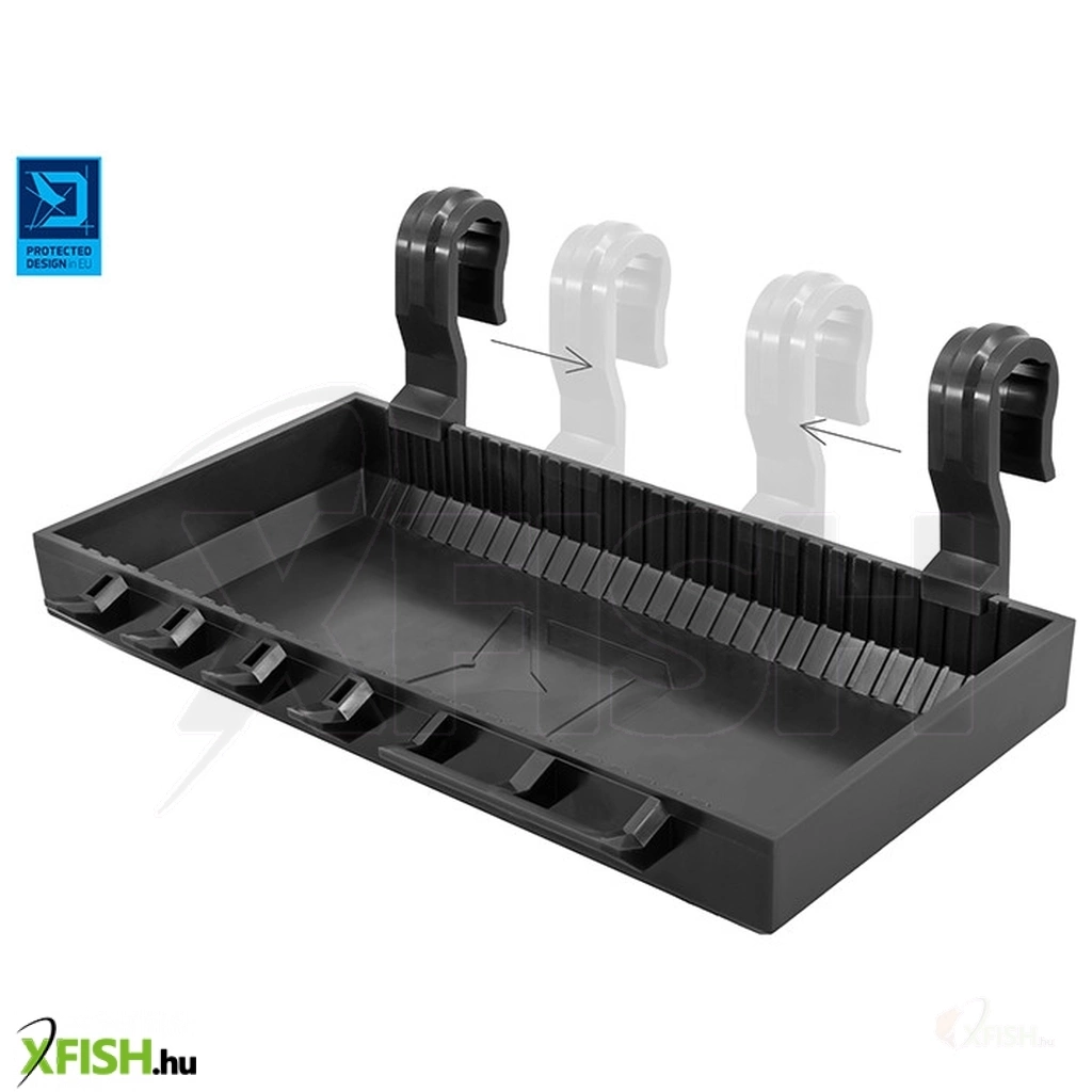 A polc elején kampók találhatók a szerelékek felakasztásához. Ezek használhatók tűk, ollók vagy más apró alkatrészek tárolására. A kivehető elválasztók lehetővé teszik a tárolóhelyiség egyéni igényeknek megfelelő optimalizálását. A polc a közkedvelt fekete BlackWAY dizájnban készül, és nagyon jól passzol a bottartóinkhoz.