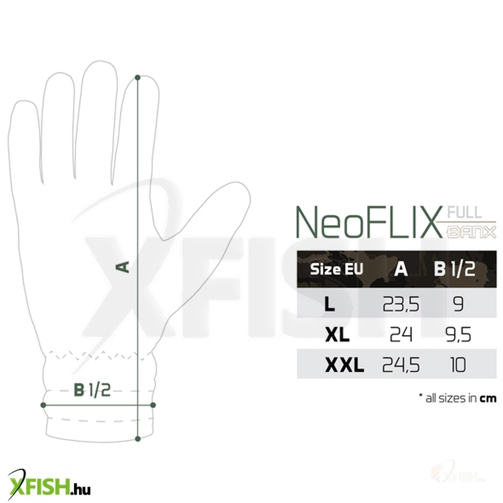 Ez a modell az attraktív BANX terepszínű mintával készült, amely tökéletesen kiegészíti meglévő felszerelését, és egyedi, modern megjelenést kölcsönöz. A NeoFLIX Banx kesztyűvel a víz és a hideg többé nem érheti váratlanul, így teljes mértékben a horgászatra koncentrálhat.