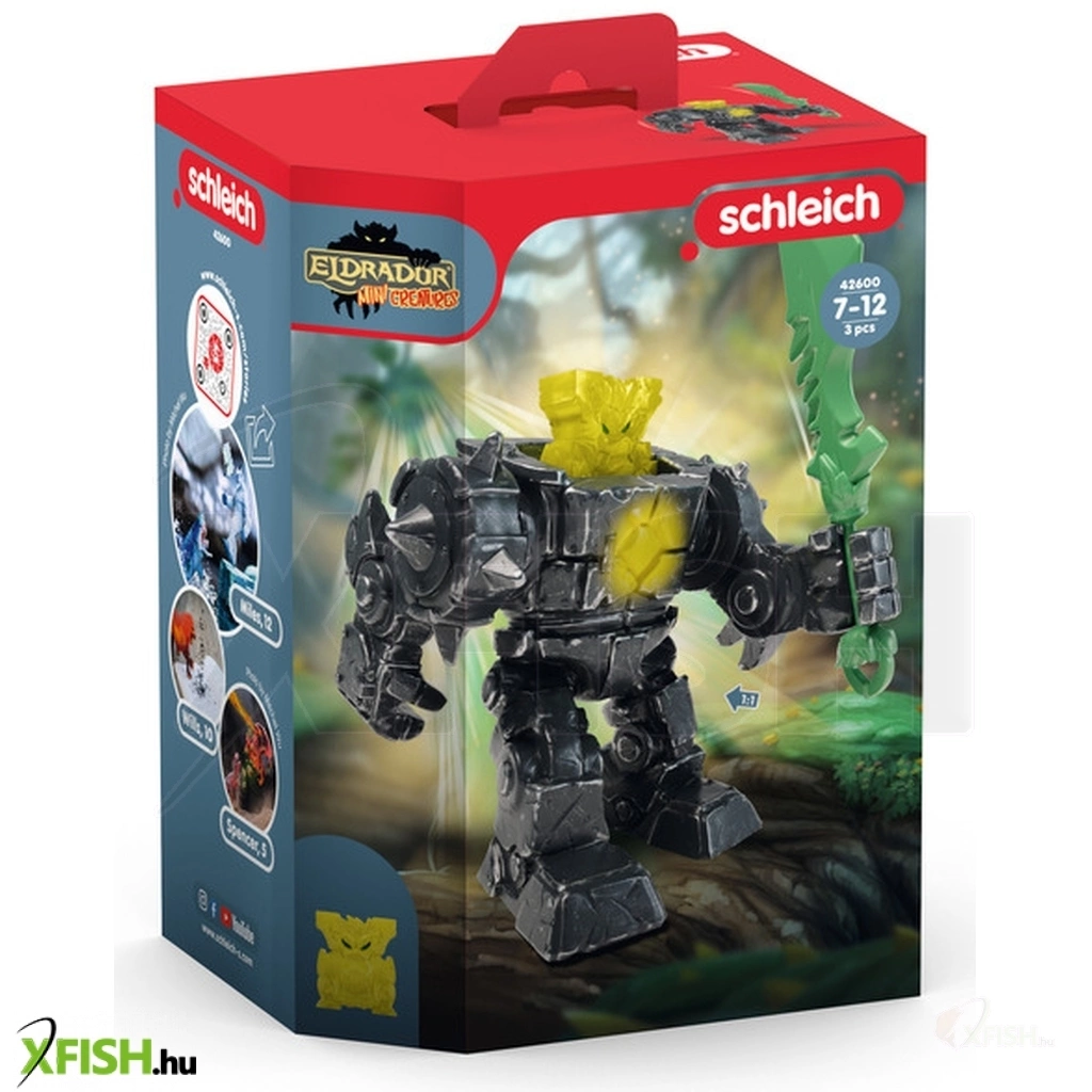 A német Schleich játékgyártó változatos tematikus világaival, élethűen és részletesen kidolgozott figuráival nemcsak a gyerekek fantáziáját mozgatja meg és kreativitását ösztönzi, de segíti fejlődésüket is. Céljuk, hogy izgalmas és nevelési szempontból is értékes játékkoncepciókat biztosítsanak a gyerekeknek, korosztálytól és érdeklődési körtől függetlenül. Filozófiájuk: játssz, érezz, tapasztalj! A Schleich figurák mindegyike kiváló minőségű, részletgazdag és egyedi készítésű, melyeket nagy odaadással, kézzel festenek meg. Az élethű kivitelezésű Schleich állatfigurák segítségével a gyerekek megtanulhatják, hogyan néznek ki az állatok és élőhelyeik a valóságban, és hogyan bánhatnak az emberek felelősen a természettel. A Schleich Eldrador Creatures figurái és készletei a videójátékból ismert fantasy világot keltik életre a gyerekszobában. A láva-, jég-, víz-, dzsungel- és kővilágban megindult a harc a szuperfegyverért. Árnypárducok, hófarkasok, lávasárkányok, tengeri szörnyek és sziklabestiák csapnak össze a fegyverért. Vajon melyik szörnyvilág kerül ki győztesként- Az árnyék dzsungel robot borotvaéles kardja éles tövisekkel borított. Segít neki, hogy megtisztítsa a dzsungel világát a bosszantó indáktól és kidőlt fatörzsektől. A robot végtagjai mozgathatóak, a kard kivehető a kezéből és a mini figura is szabadon cserélhető. A játékszett tartalma: 1 db árnyék dzsungel robot, 1 db fegyver, 1 db kivehető mini figura. Méret : 10,5 × 13,5 × 19 cm.