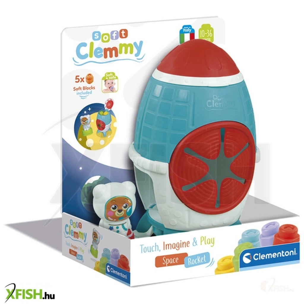 Clemmy érzékelést fejlesztő rakétás tároló puha építőkockákkal Az új Clemmy rakétás tároló egy aranyos űrhajós figurával érkezik. A puha Clemmy építőkockákkal alkothatsz, rakosgathatsz és rengeteg űrkalandot képzelhetsz el. Helyezd be a kockákat a tapintható, puha műanyag nyíláson keresztül, és vedd vissza őket a fedél kinyitásával. Az asztronauta maci az építőkockákra rakható, majd beilleszthető a rakétába, készen az indulásra és a puha Clemmy univerzum felfedezésére! A puha Clemmy kockák és a rakéta sokféle textúrájával stimulálja a gyermek tapintási érzékét, fejleszti a kézügyességet és javítja a szem-kéz koordinációt.