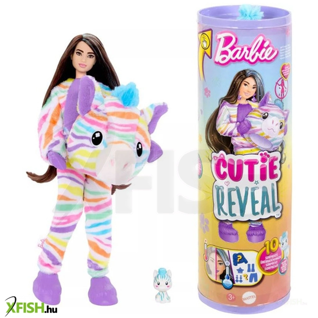 A Barbie Cutie Reveal Zebra baba készletben egy szivárványos zebra jelmezes Barbie található, aki alatt egy divatos baba rejtőzik. A szett több mint 10 meglepetést kínál, köztük egy kis zebra figurát és kiegészítőket. A levehető jelmez és a csere-ruhadarabok kreatív játékot biztosítanak, a hosszú haj formázásához pedig fésű is tartozik.
