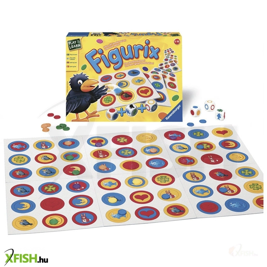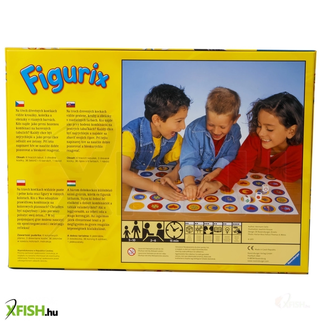 Ravensburger: Figurix társasjáték Játékosok száma: 2-6 játékos, Korosztály: 5 éves kortól ajánlott. Találd meg a helyes kombinációt! A három dobókockán különböző színű körök, gyűrűk és egyéb alakzatok találhatóak. A játékosok feladata, hogy minél hamarabb megtalálják a táblán a kockákkal dobott kombinációt. Az nyer, aki a többieket megelőzve fel tudja rakni a korongjait a táblára! A Figurix fejleszti a gyerekek megfigyelőképességét és elősegíti a gyors reagálás képességének kialakulását. A doboz tartalma: 6 db játéktábla, 3 db dobókocka, 36 db korong (6 színben), magyar nyelvű játékszabály.