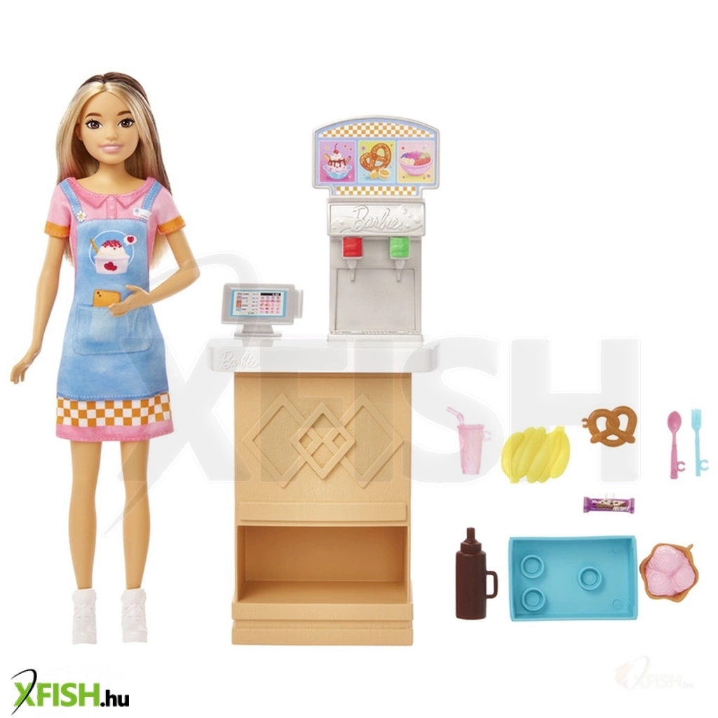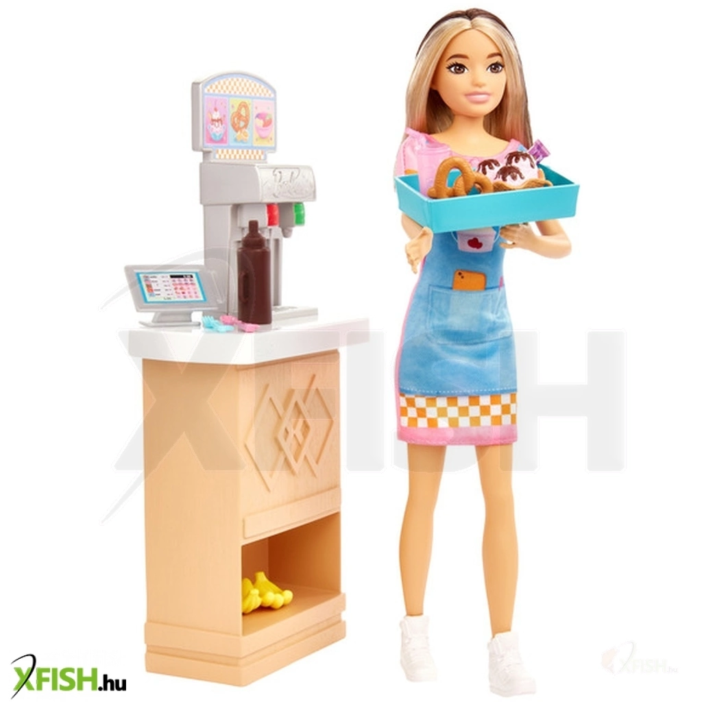 Barbie Skipper first jobs - büfé A Barbie Skipper First Jobs babákkal és játékkészletekkel Barbie tini húga, Skipper segítségével a gyerekek felfedezhetik a munka világát. A Skipper és a nagy bébiszitter kaland animációs film ihlette büfé készletben Skipper nemcsak az eladó, hanem a cukrász szerepét is magára öltheti, és finom édességeket készíthet. A készlet a baba mellett egy pultot tartalmaz, amelyen pénztárgép, üdítőautomata, kínálótálca, valamint sok-sok finomság és kiegészítő rejlik. A készlettel a gyerekek eljátszhatják, ahogy Skipper elkészíti a finomságokat (pl. a hideg víz hatására csokimintássá váló fagylaltkelyhet), majd kiszolgálja a vendégeket. A baba stílusos ruhát visel, haja vagány szőke és barna színű. A baba nem áll meg magától. Csomagolás mérete: 18,5 x 32,5 x 6,8 cm.