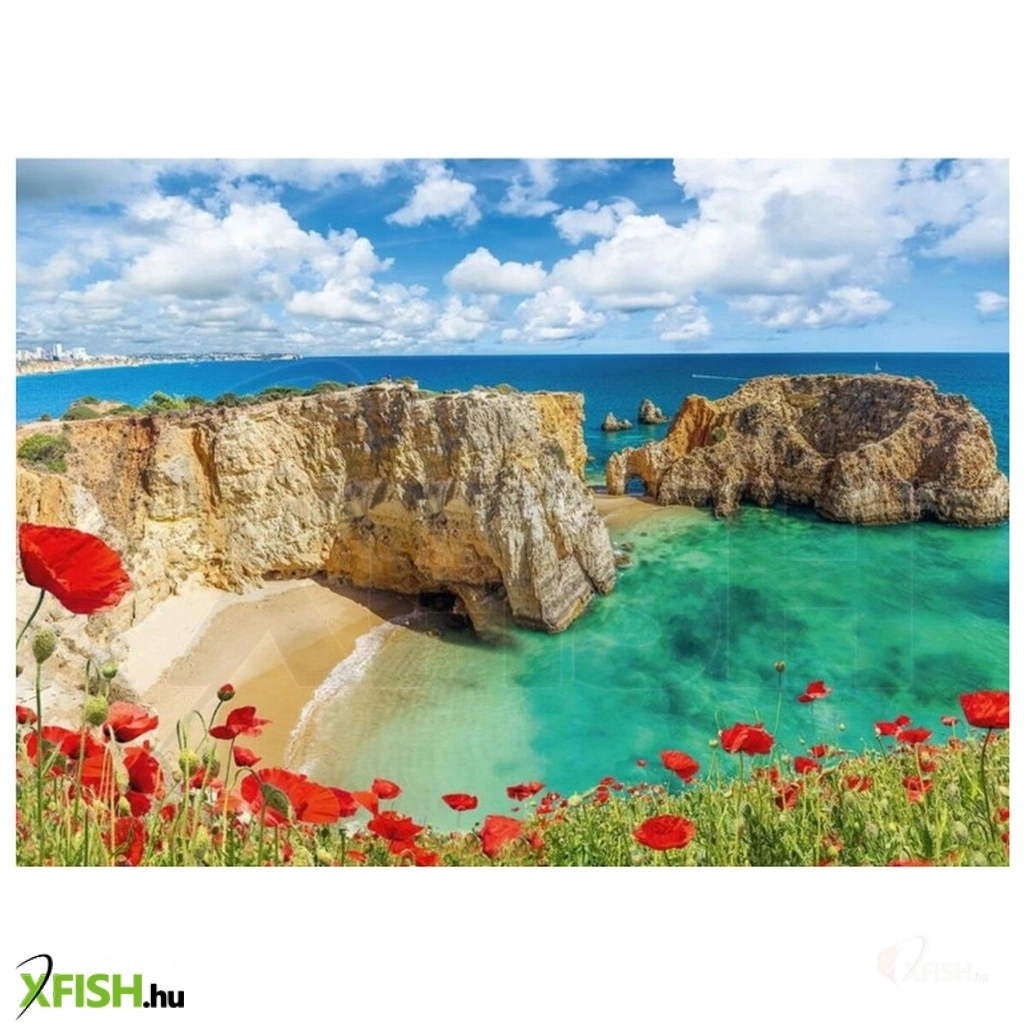 A Ravensburger 1000 db-os puzzle - Pipacsok Algarveban című képén a portugál tartomány sziklákkal és csodás pipacsokkal tarkított tengerpartja látható.