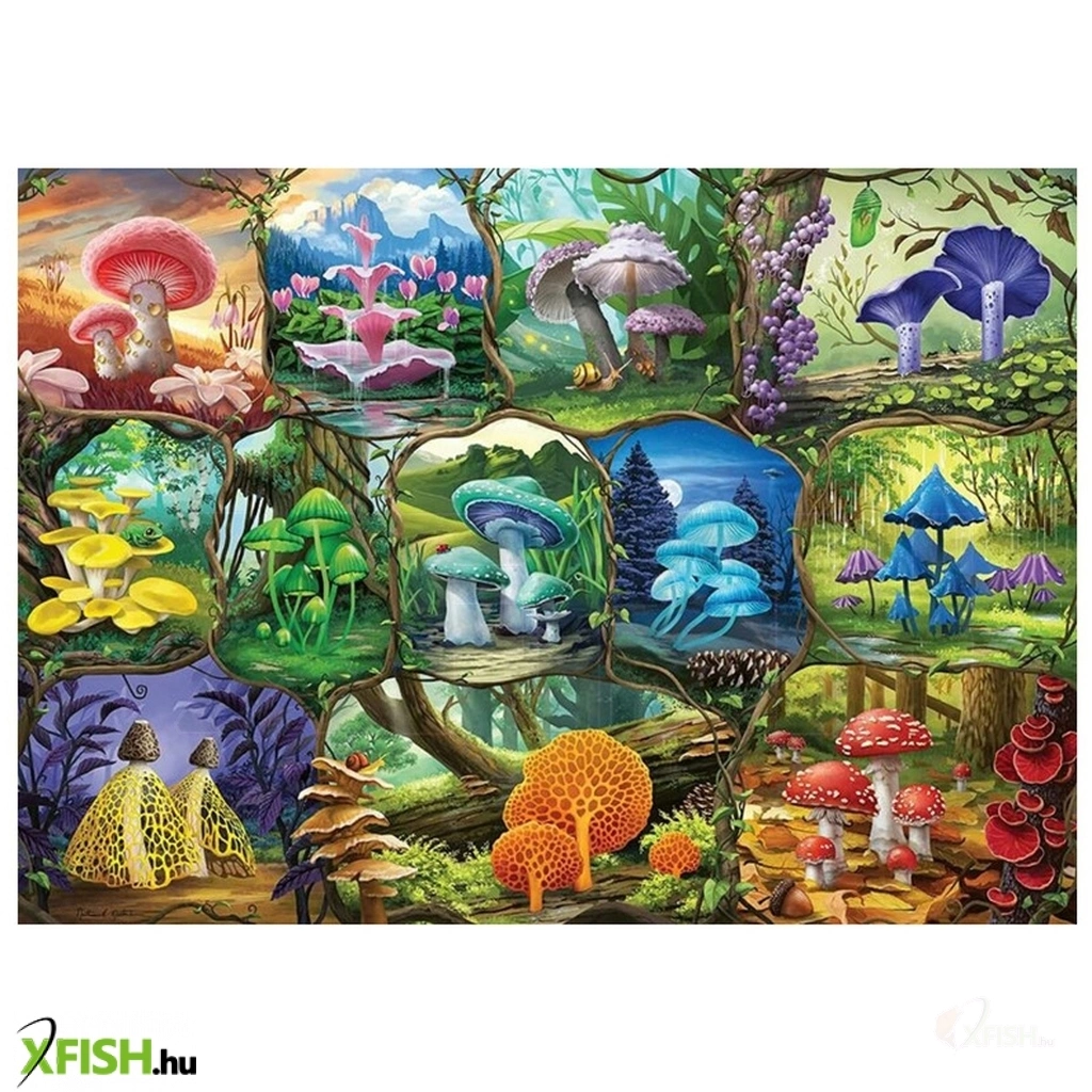 A Ravensburger 1000 db-os - Beautiful Mushrooms című képet a világ különböző területein fellelhető, különleges gombafajták - Fátyolos hölgy gomba, Légyölő galóca, Világító tölcsérgomba - színesítik meg.