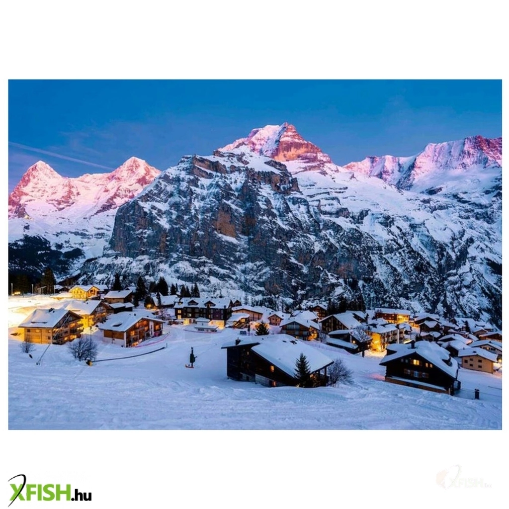 A Ravensburger 1000 db-os - Beautiful Mountains - Mürren, Bernese Oberland című képen egy tipikus svájci üdülőfalu látható. A festői szépségű Mürrent övező alpesi csúcsokról lélegzetelállító panoráma tárul a turisták elé.