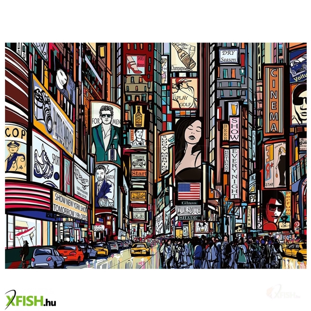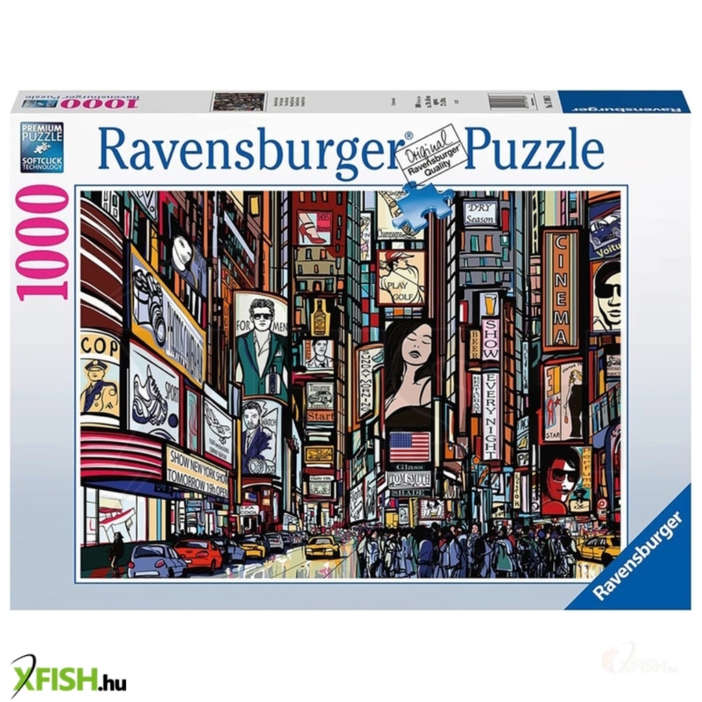 A Ravensburger 1000 db-os - Colourful New York című képen a Times Square nyüzsgő forgatagának és színes hirdetőtábláinak hangulatos illusztrációja látható.