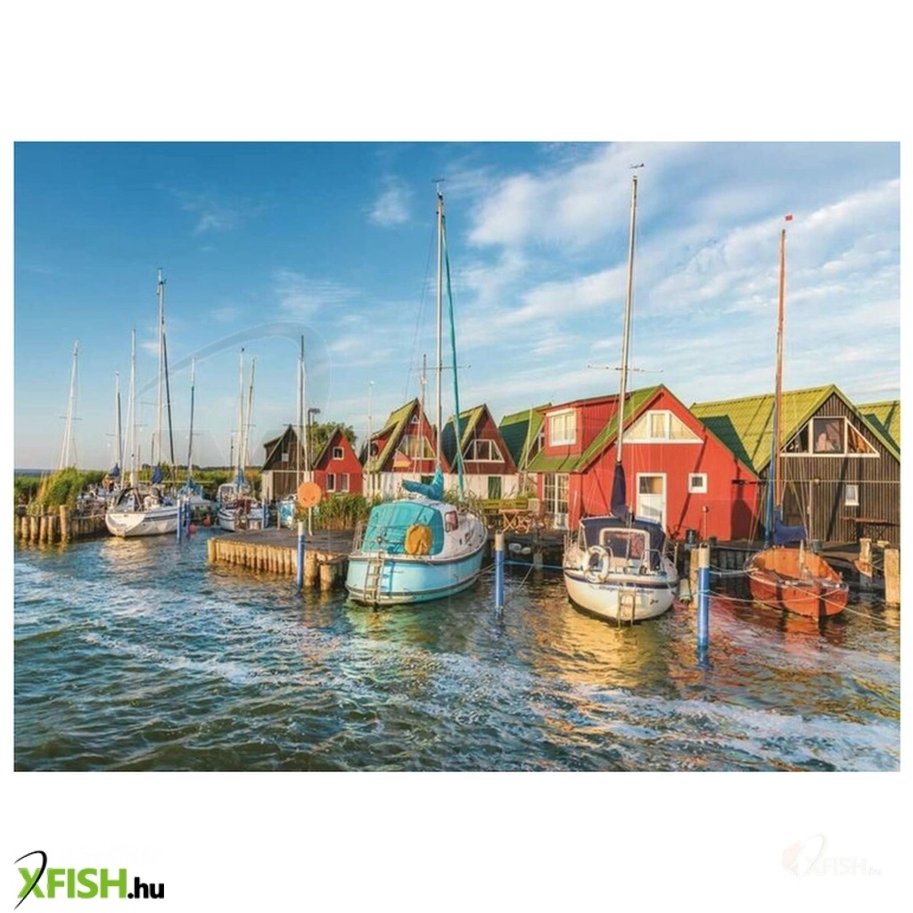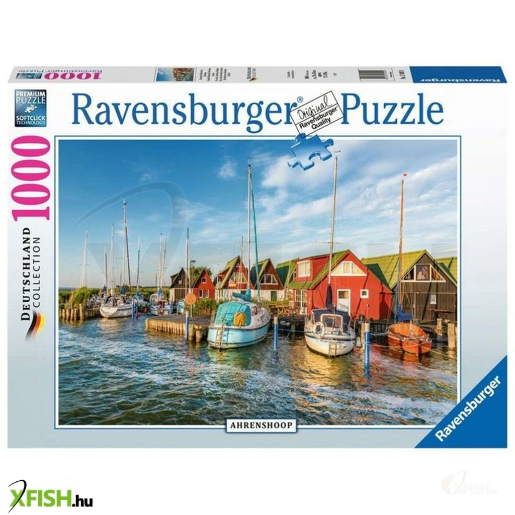 A Ravensburger 1000-db-os puzzle - Ahrenshoop romantikus kikötői világa című képen egy német kisváros meseszép hajókikötője látható