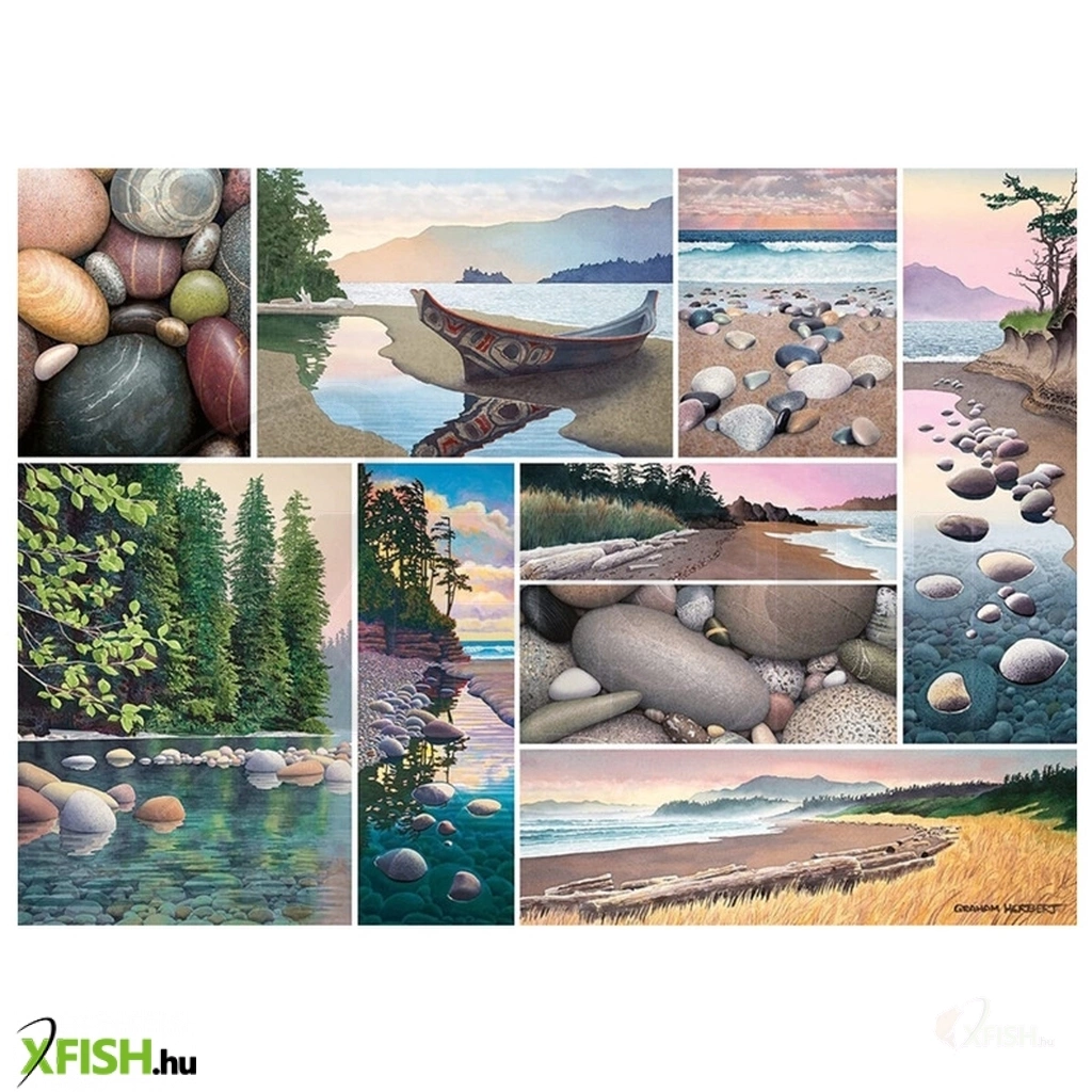 A Ravensburger 1000 db-os puzzle - Canadian Collection - West Coast Tranquility című képen Graham Herbert gyönyörű festményeinek kollázsa látható, melyek Kanada nyugati tengerpartjának nyugalmat sugárzó természeti képeiből állnak össze.