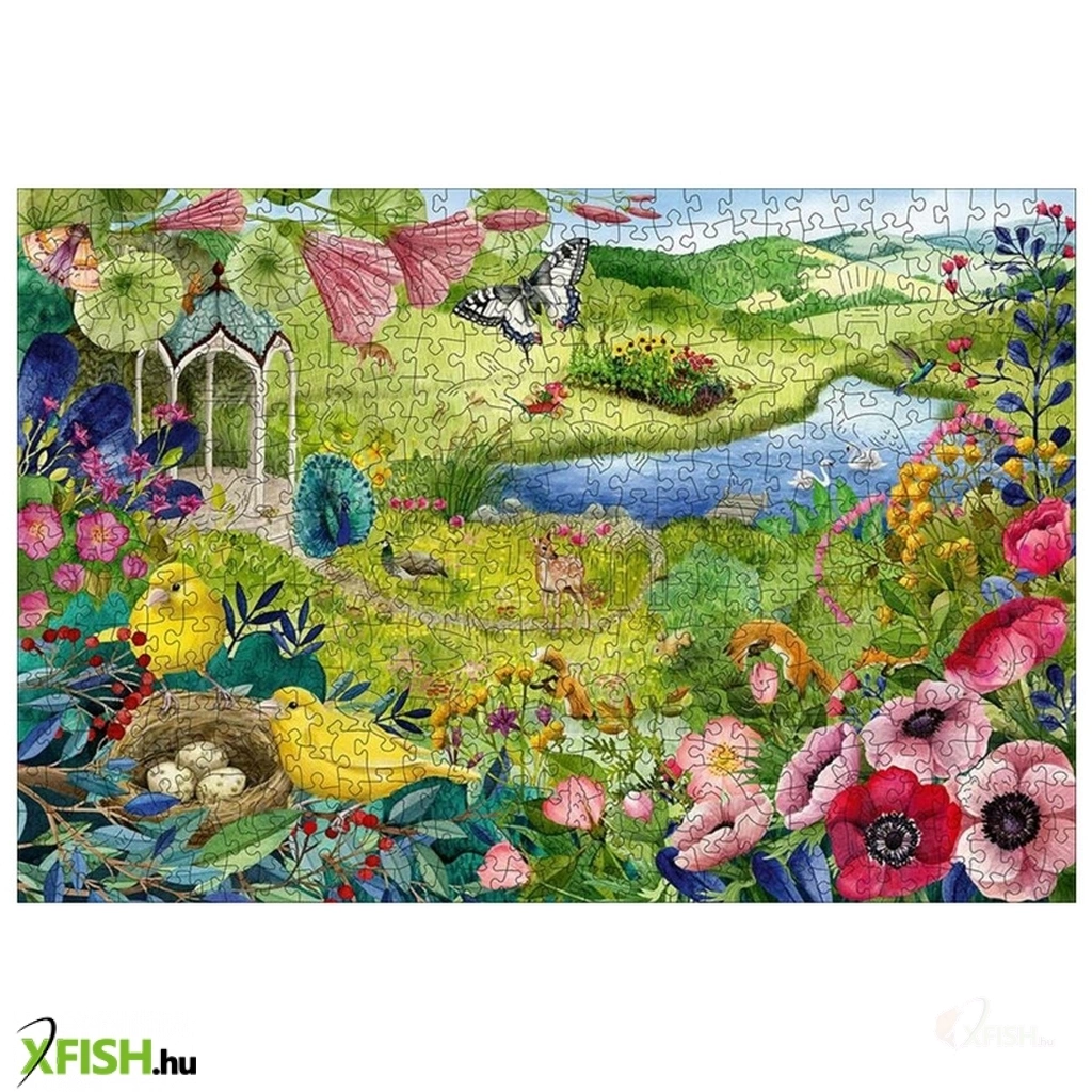 A Ravensburger 500 db-os fa puzzle - Wild Garden című képen a színpompás virágok között erdei állatokat, madarakat, pillangókat is találunk.