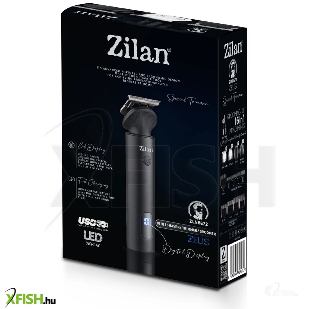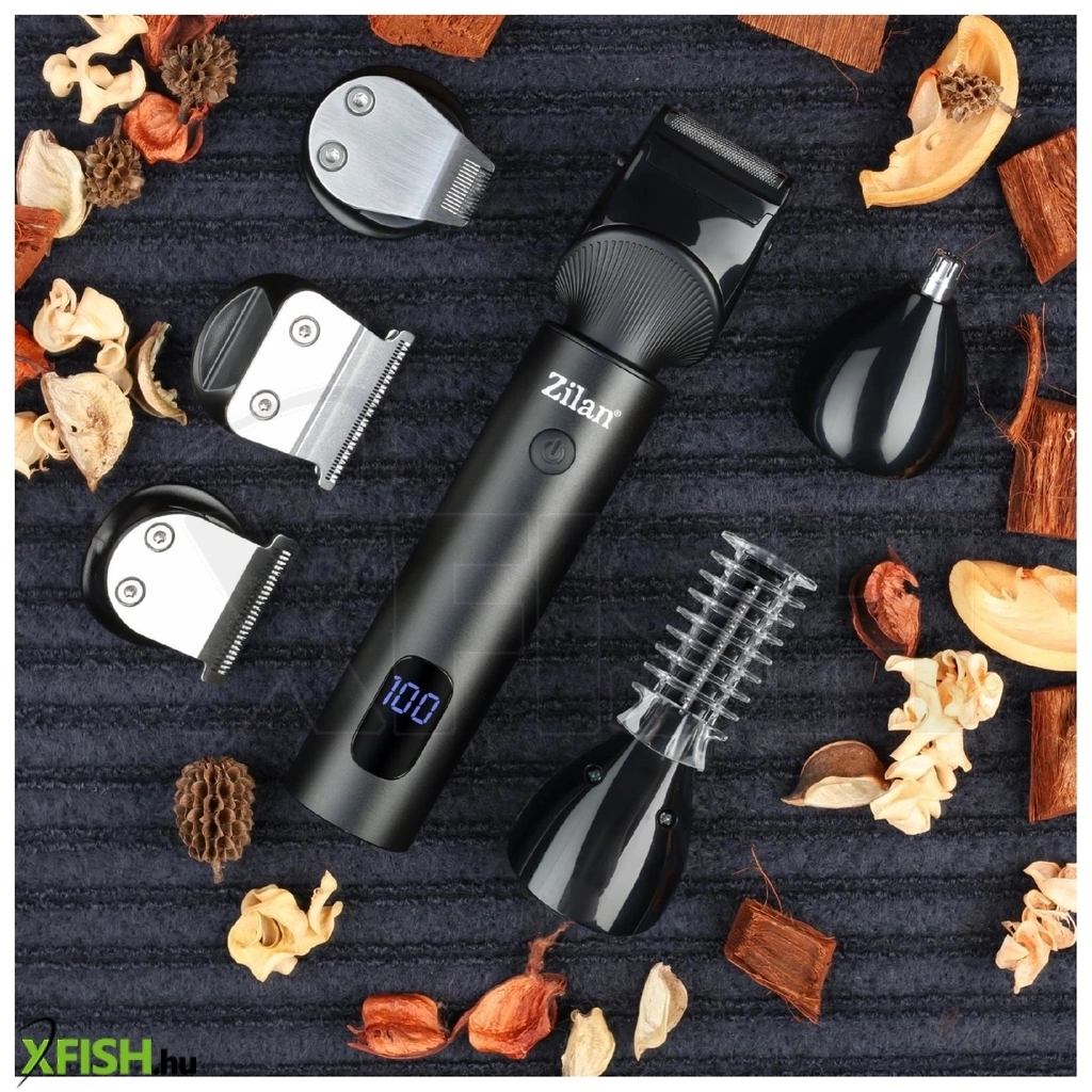 Zilan zln8672 zeus haj- és testszőrnyíró készlet, rozsdamentes acél penge, 15 féle tartozék fej, LED kijelző, alumínium ház