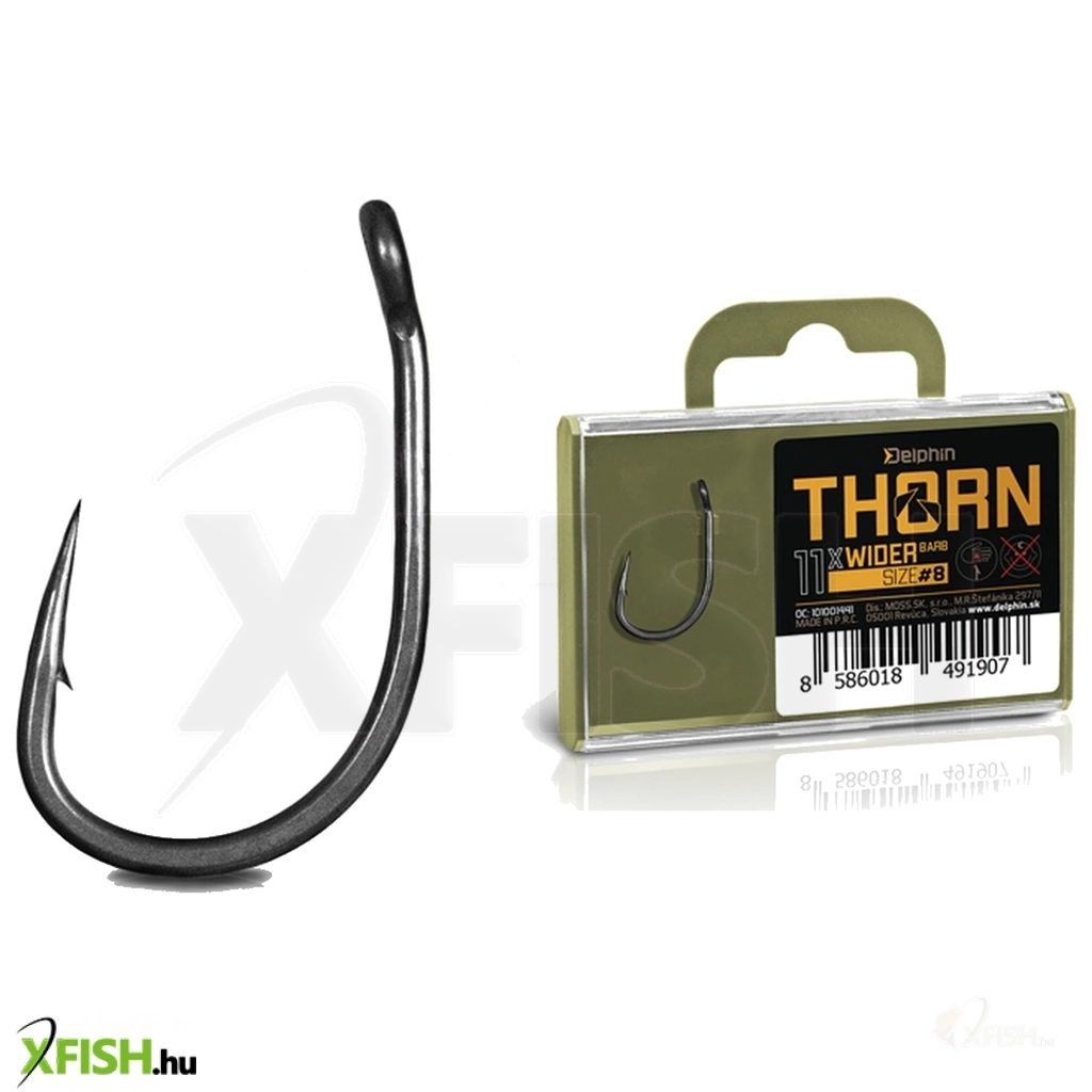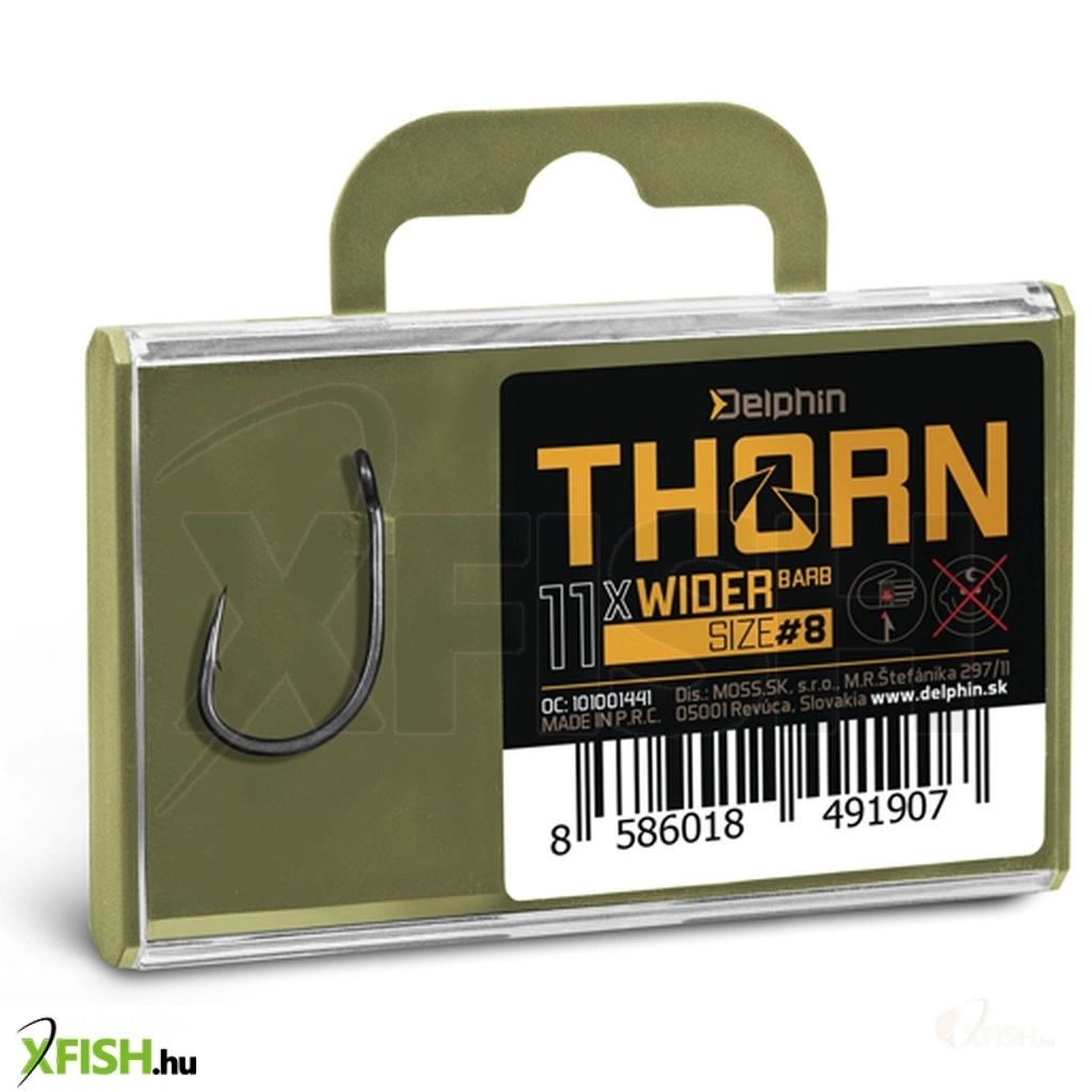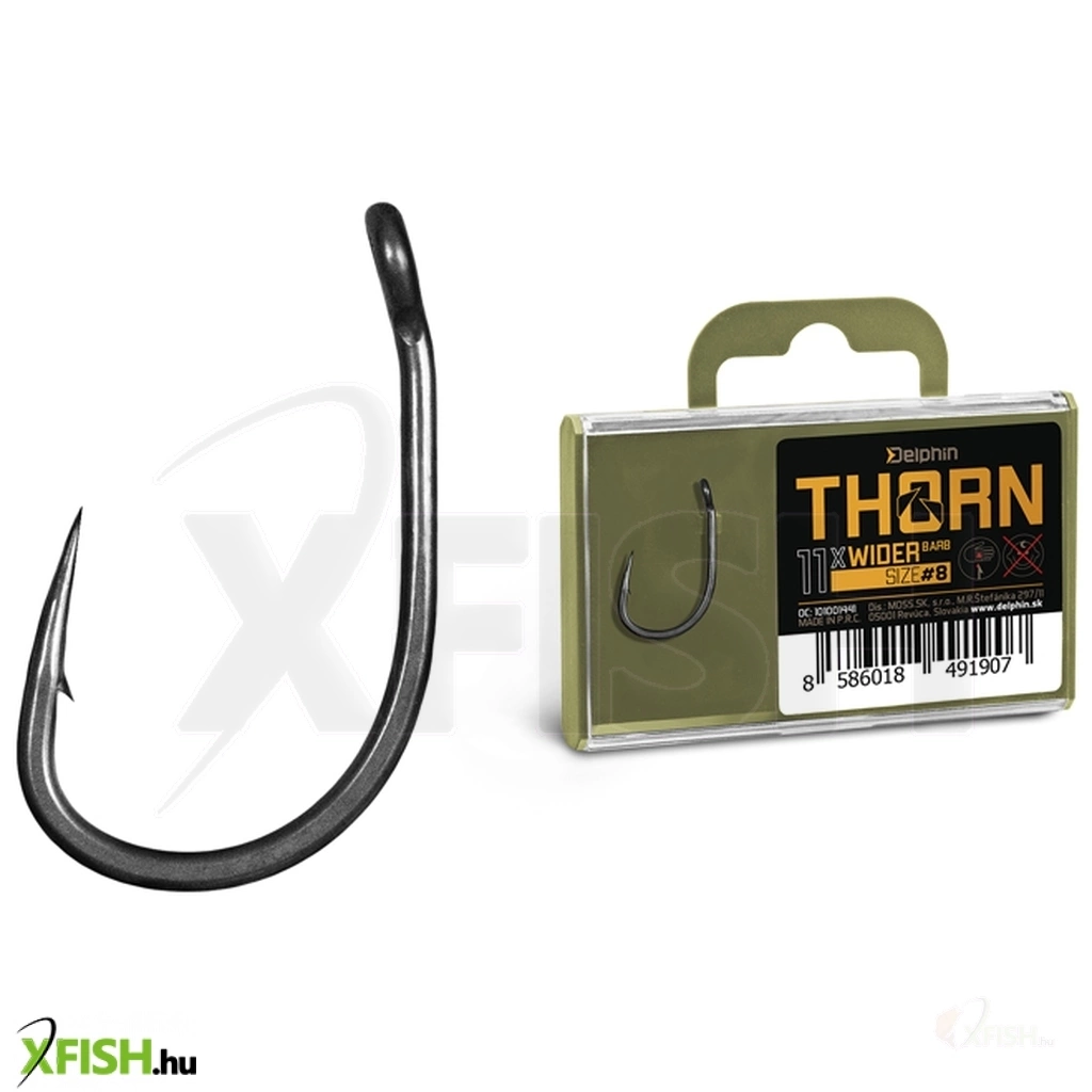 A Delphin THORN egy prémium kategóriás pontyozóhorog a legmagasabb minőségben. A gyártásban alkalmazott modern technológiáknak köszönhetően ezek a horgok egyet jelentenek a kompromisszumok nélküli szilárdsággal és a maximális élességgel. A THORN sorozat horgai titanX felületkezeléssel rendelkeznek, ami matt szürke felületet eredményez nekik, amely szintén tökéletesen sima a ponty szájába való könnyű behatolás érdekében. A TitanX gondoskodik az egész horog megerősítéséről és tartósságáról is.