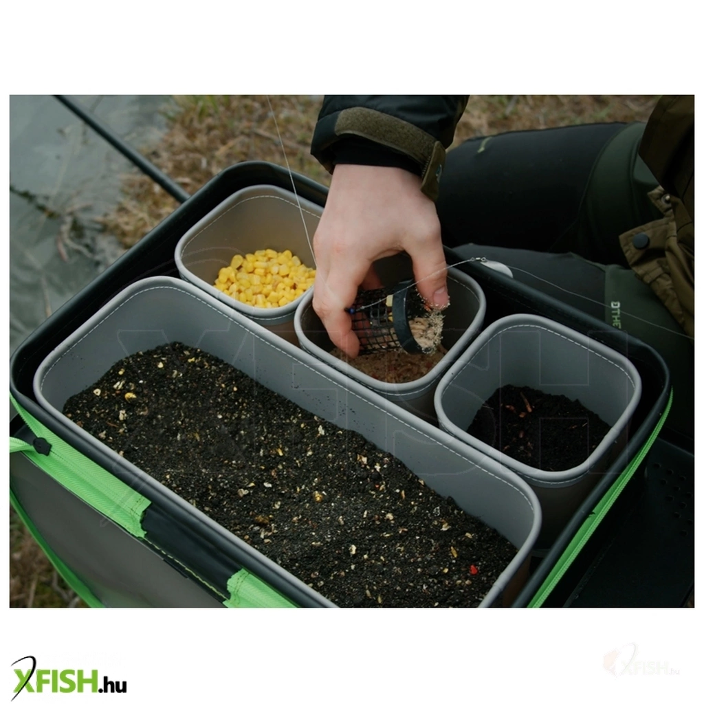 Nagy előnye a cipzárral zárható fő rekesz, ami - a belső tálcák kivétele után - önálló szállítótáskaként is használható. A zárható fedél kulcsszerepet játszik a tartalom védelmében – gátat képez a közvetlen napsugárzás ellen, megakadályozza az etetőanyag kiszáradását, és védi az élő csalit a gyors romlástól. Így az etetőanyag-keverékek a teljes horgászat során megőrzik optimális nedvességtartalmukat és vonzó aromájukat.