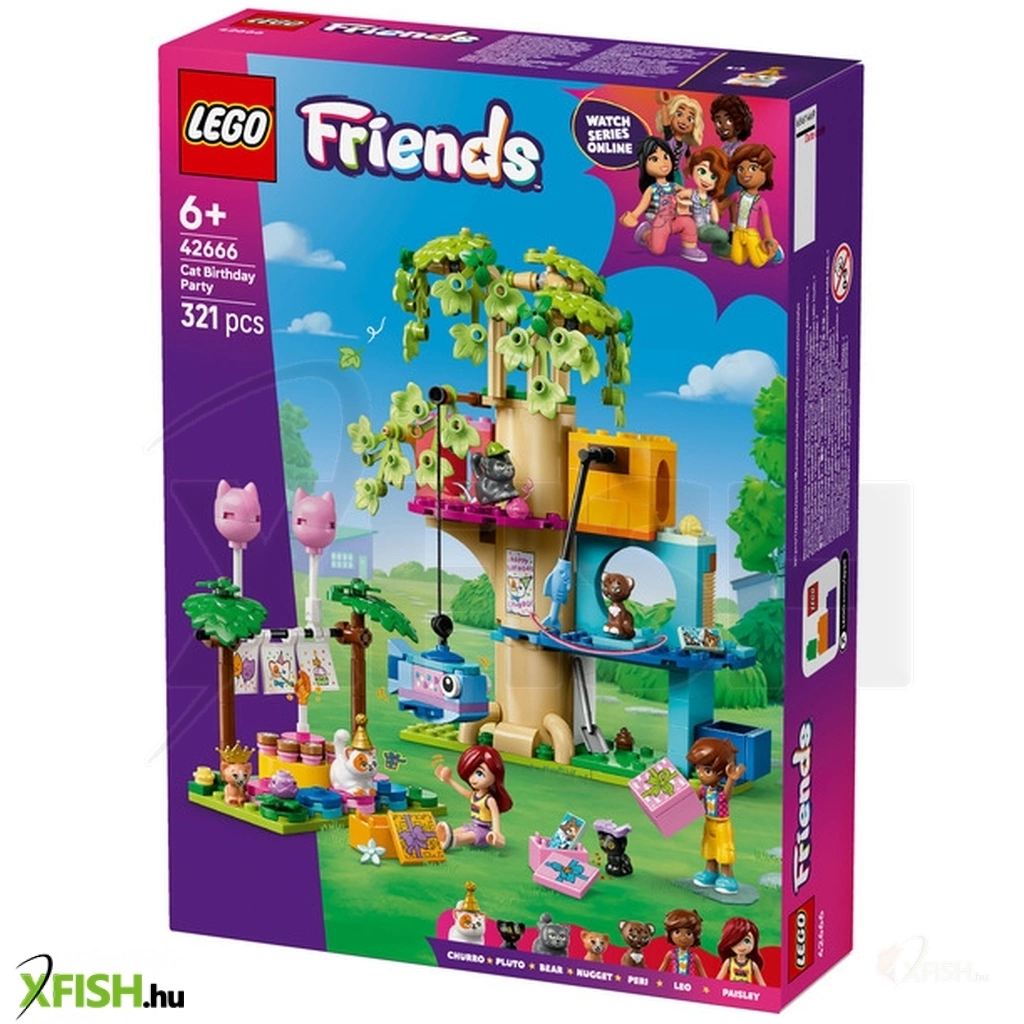 Lego Friends 42666 Születésnapi cicazsúr és lombház cicáknak Fedezz fel egy 6+ éves lányoknak, fiúknak és cicarajongóknak készült, macskasztikus készletet! A Lego(R) Friends Születésnapi cicazsúr és lombház cicáknak (42666) játékhoz 2 minibabafigura, 5 macskafigura és rengeteg kiegészítő tartozik, hogy cicás pillanatokkal teljen meg a fantáziadús játék. Ez a szórakoztató játékszett Churro születésnapi zsúrját jeleníti meg, ahová Churro 4 cicabarátja, valamint a Lego Friends szereplők, Leo és Paisley is hivatalosak. Fedezd fel a szórakoztató részleteket, például a születésnapi ajándékokat, a zászlókat és a cicaalakú lufikat. A gyerekek örömmel mutatják majd meg a cicáknak a macskalombházat, ahol halformájú pinyáta, macskajáték, macskafű, szökőkút és macskaalom található. Utána a cicák asztalhoz ülnek, és megkóstolják Churro születésnapi tortáját. Annyi játéklehetőséget rejt ez az állatfigurás készlet, hogy a gyerekek mindig újabbnál újabb történeteket játszhatnak el vele.