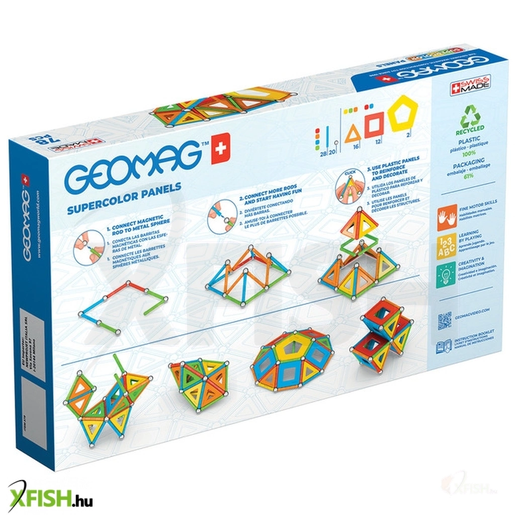 Geomag Supercolor Panels Recycled 78 db Fedezd fel a 78 darabos építőjáték varázslatos világát, ahol az egyszerűség és a szórakozás találkozik a mágnesesség csodájával. A játék során a mágneses végű rudakat csak hozzá kell illeszteni a golyókhoz, és máris indulhat az építkezés, ahol a térbeli alakzatok megalkotása gyerekjáték. A készlet jellemzői: - Háromszög alakú panelek: Ezekkel az elemekkel az elkészült alakzatokat befedheted, így még változatosabbá téve az építményeket. - Vibráló színek: A dobozban található építőelemek élénk színei felkeltik a figyelmet és ösztönzik a kreativitást. - Fenntarthatóság: A játék különlegessége, hogy az összes építőelem 100%-ban újrahasznosított anyagokból készült, ami a környezettudatos szülők számára is ideális választás. Előnyök: - Fejlesztő hatás: A játék során a gyerekek fejleszthetik kézügyességüket, kreativitásukat és logikus gondolkodásukat. - Oktatás: A mágnesesség alapelveinek játékos megismerése mellett a gyerekek térbeli érzékelése is javul. A 78 darabos építőjáték tökéletes választás azok számára, akik egy egyszerű, mégis rendkívül szórakoztató és oktató játékot keresnek. Válassz egy játékot, amely ötvözi a szórakozást a tanulással és támogatja a fenntartható fejlődést – válassz egy olyan készletet, amely inspirálja a gyerekek fantáziáját és támogatja a bolygónk védelmét!