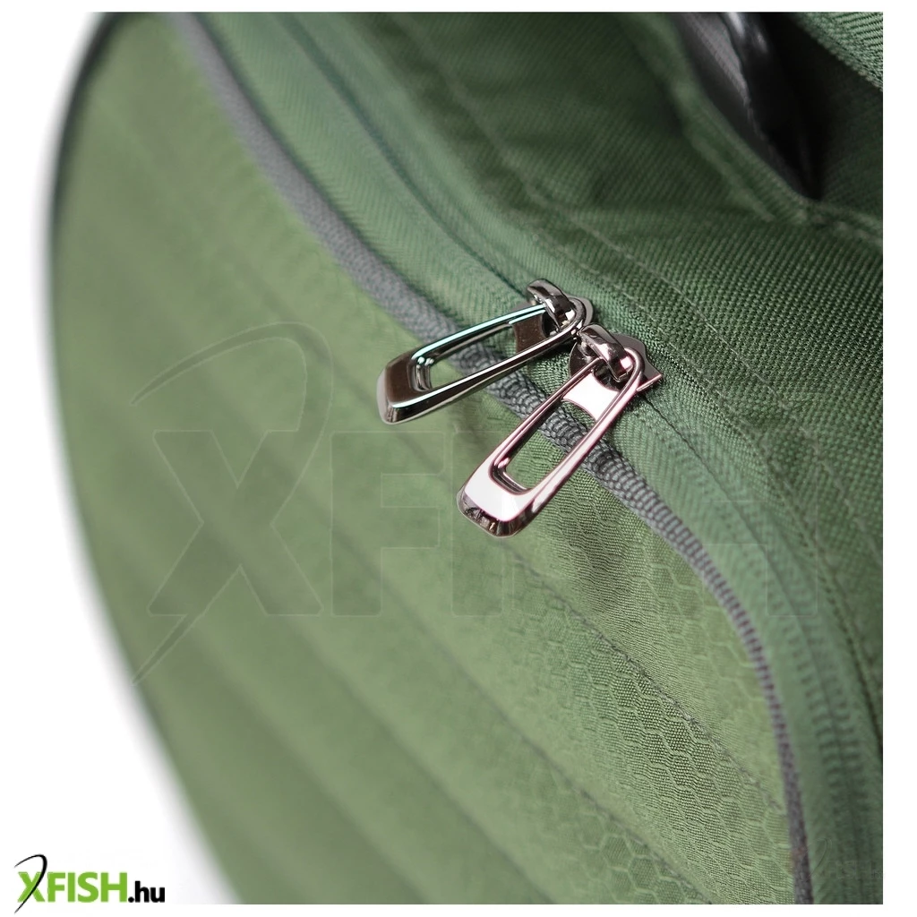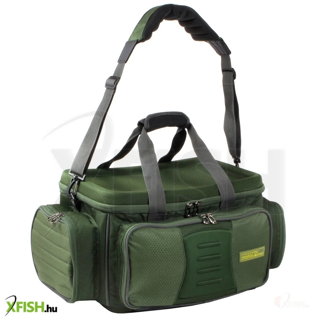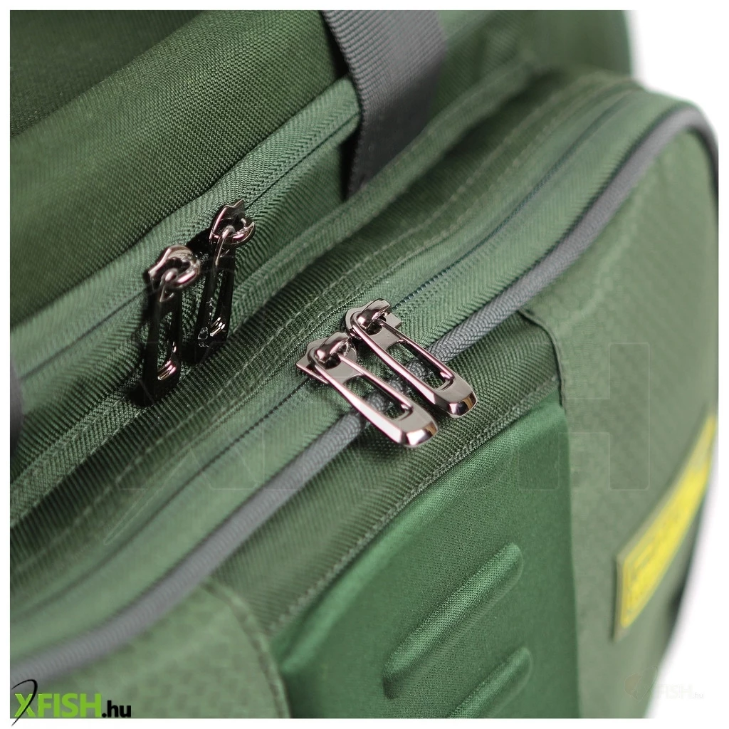 Tulajdonságok: Méret:55cm x 35 cm x 26cm-Zöld színű praktikus, nagy pontyozó táska szivacsos vállpántal.-1db nagy tároló rekesz-3db külső cipzáras tároló-4db diptartó flakon