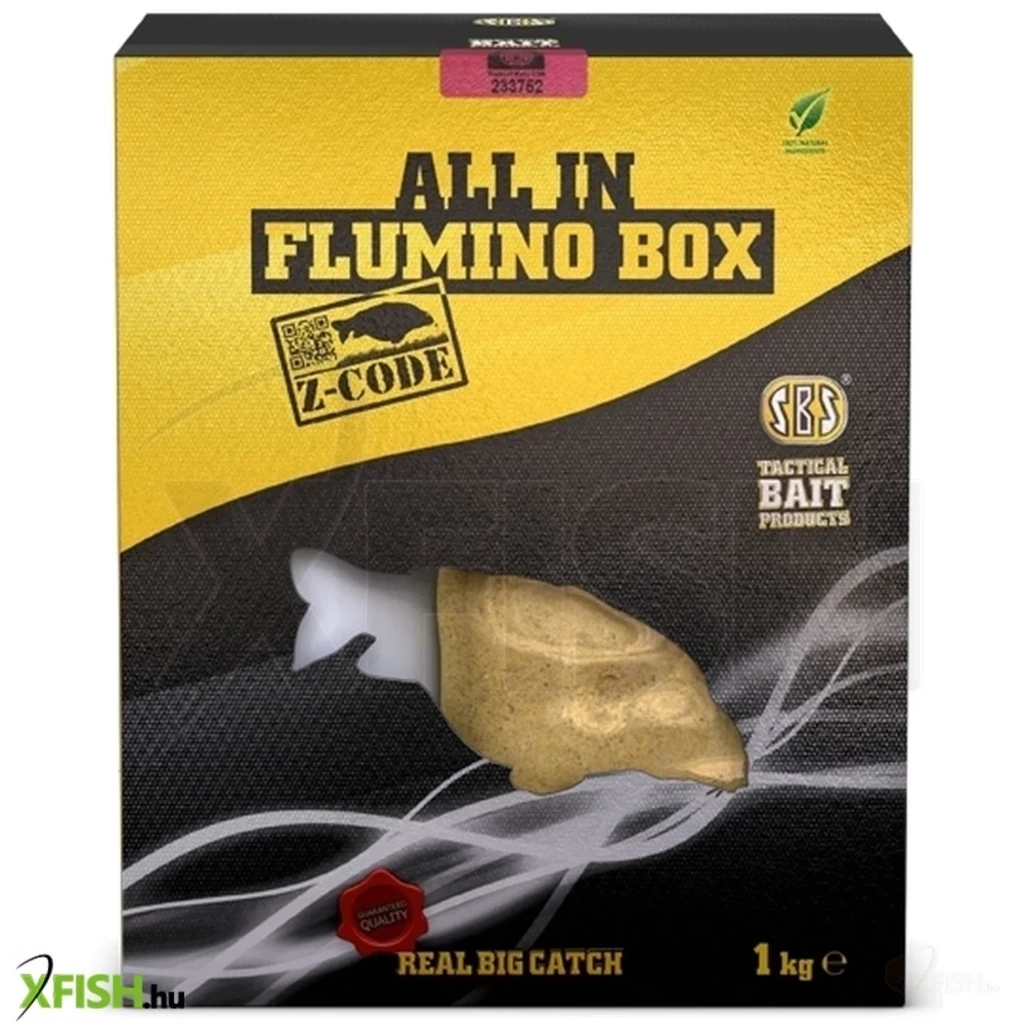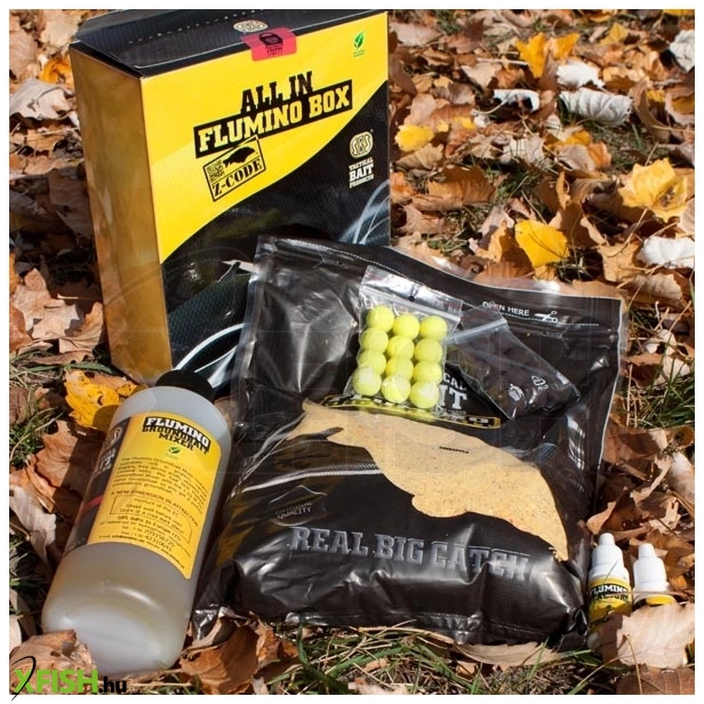 Ez a komplett csomag szintén az SBS legújabb termékfejlesztéseinek eredményeként látott napvilágot. Biztosan mindannyian kerültetek már olyan helyzetbe, amikor az addigi jól bevált csalik és technikák teljesen hatástalannak bizonyulnak. Ennek a jelenségnek az egyik leggyakrabban előforduló oka az, hogy a halak nem a fenék közelében tartózkodnak és nem is ott táplálkoznak. Az All In Flumino Box Z-code termék ennek a helyzetnek az eredményes horgászatát teszi lehetővé. A Z-code név a vízközti horgászatra kifejlesztett szerelékre, a Zig-Rigre utal. Az All In Flumino Box Z-code komplett csomag tartalma: 1 kg Flumino Groundbait Z-code etetőanyag, 500 ml Flumino Groundbait Mixer, 1-1 tasak Pineapple (ananász – sárga színű) és Black Squid (fekete tintahal – sötétbarna színű) 14 mm-es Pop Up horogcsali, valamint 2x2 ml aroma Pineapple és Black Squid ízesítésekben. Az etetőanyag különlegessége az összetételében rejlik. A Z-code etetőanyag az élénk fluro színű részecskék és a magas proteintartalmú pelletek liftező tulajdonságának köszönhetően az egész vízoszlop magasságában dolgozik. Erőteljes felhősítő hatással is rendelkezik, amitől a halak még bátrabban táplálkoznak. Ha az etetőanyagot pasztaólomra, vagy etetőkosárba szánjuk, akkor adagoljuk hozzá az 500 ml Groundbait Mixert. Ha azonban spombbal, vagy etetőrakétával etetünk, akkor adjunk hozzá még kb. 500 ml-t a tó vizéből is, hiszen ekkor az etetőanyagot nagyon lágyra, szinte tocsogósra ajánlott hígítani. A tesztelési fázisban ez a termék is kiemelkedőt alkotott. A 2012-es Bolsenai World Carp Classic győztesei, Micula Péterék is használták a Z-code-ot, köszönhetően a viszonylag magas aljnövényzetnek. Még egy verseny győzelem köthető a termékhez, melyet az SBS Happy Carp Gang csapata ért el az ABK IV. Bojlisokk versenyén.