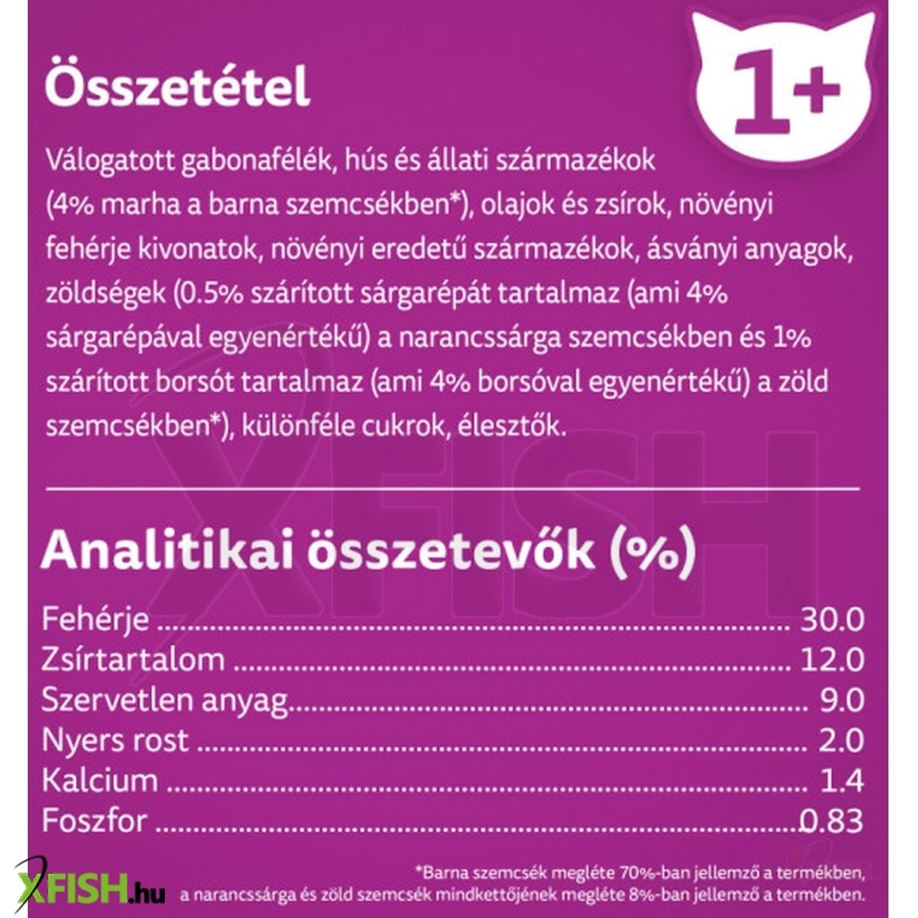 Válogatott gabonafélék, Hús és állati származékok (ebből 4% marhahús a piros színű szemcsékben), Olajok és zsírok, növényi fehérje kivonatok, növényi eredetű származékok, ásványi anyagok, Zöldségek (4% sárgarépa a narancssárga színű szemcsékben, 4% zöldborsó a zöld színű szemcsékben)