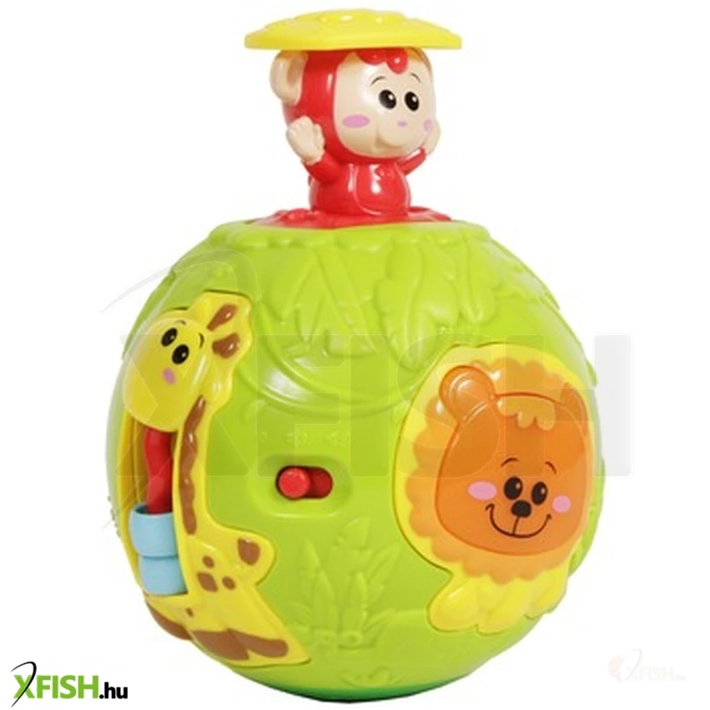 Ugraszd ki a kismajmot a labda belsejéből! A Világító dzsungel labda bébijáték egy műanyagból készült színes golyó, a dzsungelben élő állatokkal díszítve. Az elefánt pocakja csörgő golyót rejt magában, a zsiráf nyaka karikákkal van díszítve, és ha megnyomod az oroszlánt, a játék világítani, zenélni kezd, és a labda tetején előugrik a piros kismajom is! A labda gyorsan gurul, ezért fejleszti a baba mozgékonyságát, ügyességét, és a megfigyelést is. A játék 2 darab AA ceruzaelemmel működik, a csomagolás az elemeket tartalmazza. A Világító dzsungel labda bébijáték átmérője: 15 cm.