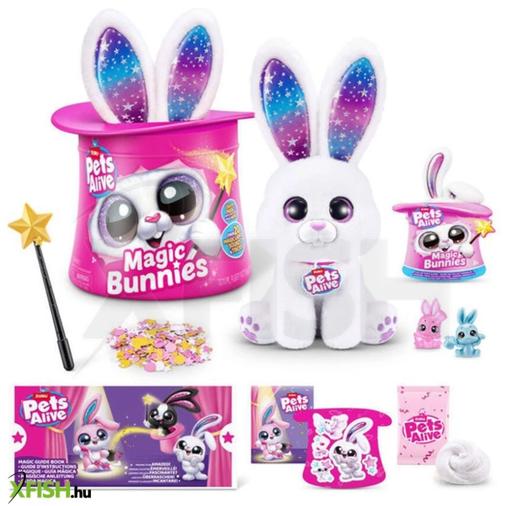 Pets alive, magic bunny Zuru Pets Alive Magic Bunny, a nyuszi amit egy varázsütésre kihúzhatsz a kalapból. Tényleg van a kalaphoz egy varázspálca, amit egy két suhintás után oda kell érinteni a kalaphoz, mert annak a varázslatos zárszerkezete csak akkor fog kinyílni. Ha sikerült a varázslat, akkor a nyuszi füle elkezd villogni és hangos zárnyitást fogsz hallani. És ha kinyílt a kalap, akkor ki is tudod venni belőle ezt a nagyon édes nyuszikát, ami 3 színben érhető el. Ha színt szeretnél választani, akkor azt jelezd felénk a rendelésnél a megjegyzés rovatba. A kalapon belül van egy titkos kis rekesz is amiben találtok még 3 féle nyuszifigurát. A kalapban ezen kívül van még konfetti, tehát amikor kihúzod a nyuszit a kalapból, akkor azzal egy csomó csillogó konfetti is kirepül, mint egy igazi varázslatkor. A nyuszi plüssből készült, nagyon kellemesen simogató, imádják a gyerekek. Tényleg annyira cukik ezek a nyuszik, nézd csak meg őket. A csomagban találsz továbbá matricákat is, amivel szuperül fel tudod díszíteni a kalapot. A varázskalap vissza is zárható ugyan úgy ahogyan azt kinyitottad a varázspálcával.